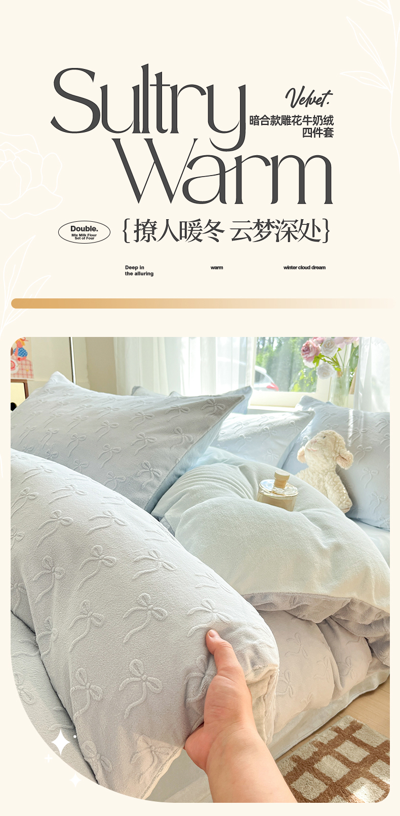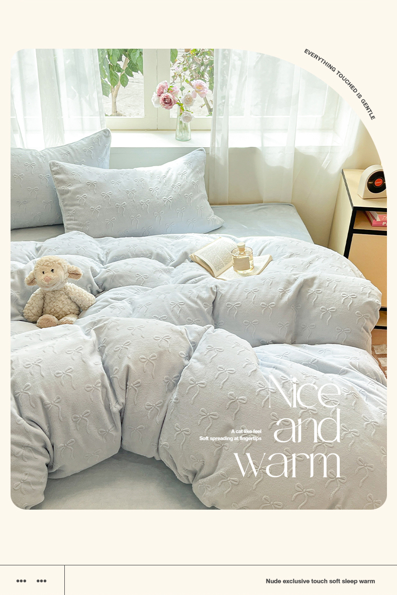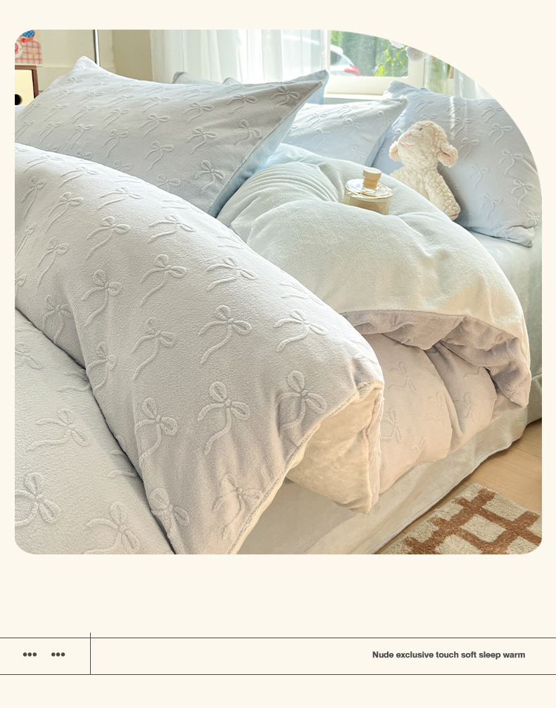 绘萱家居 2025新款高克重雕花雕印纯色牛奶绒四件套双拼法莱绒珊瑚绒 甜蜜结-蓝