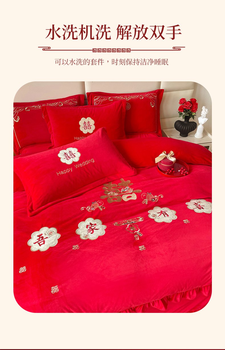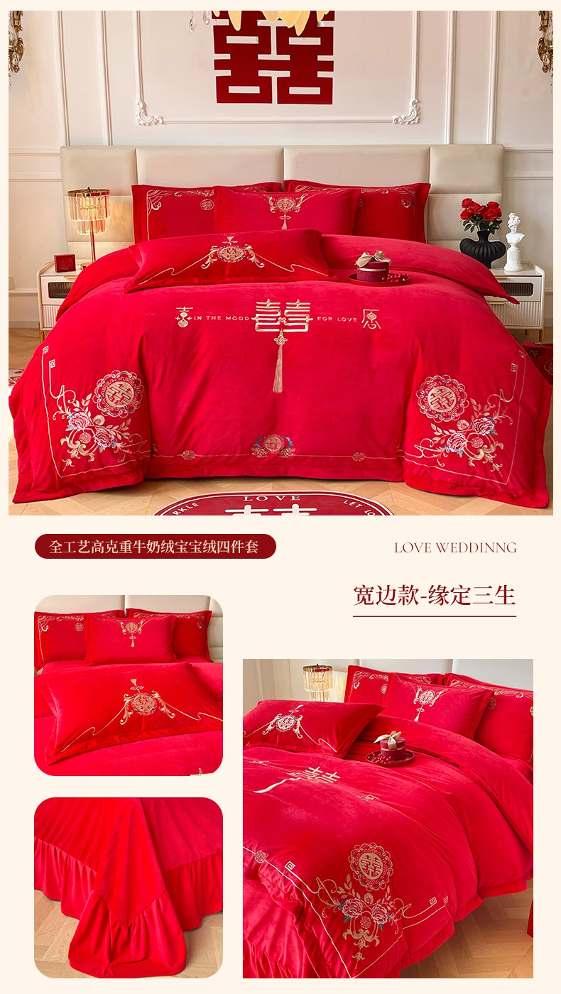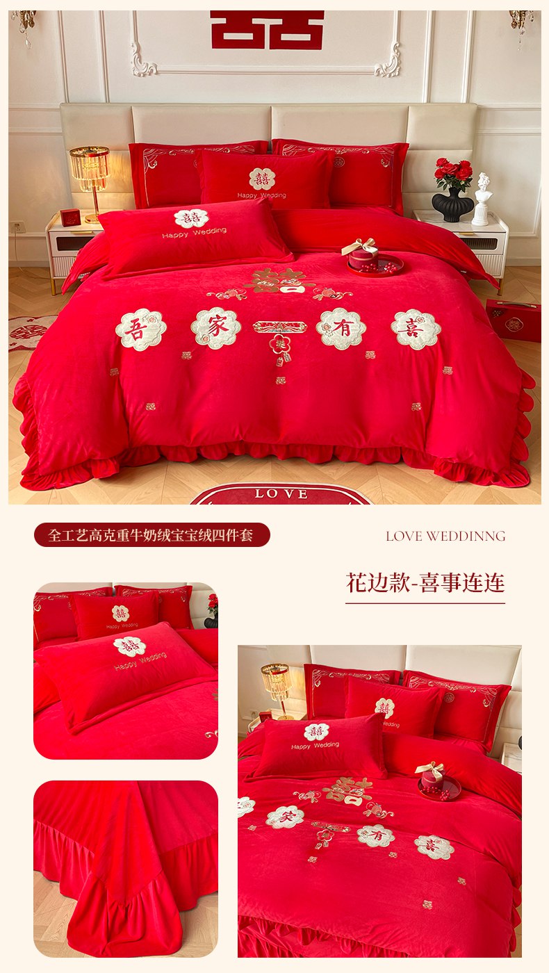 当前位置: 91家纺网 > 商品网购 > 床品套件 > 四件套 > 婚庆四件套 > 富之雅婚庆 2025新款高克重全工艺牛奶绒宝宝绒刺绣婚庆四件套 喜事连连(花边款宝宝绒)