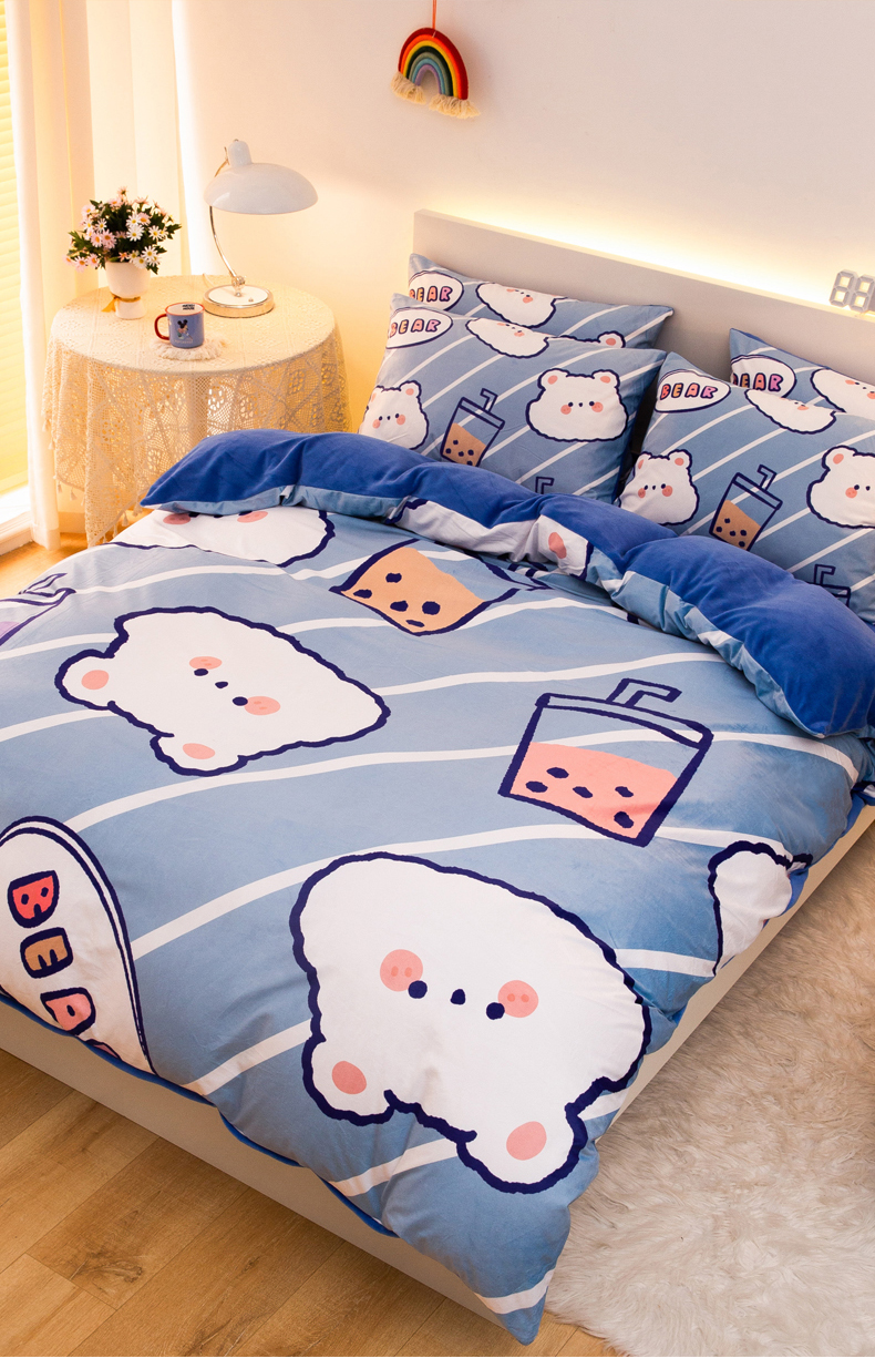商品名称:一电 2025外贸跨境电商儿童卡通床上四件套亲肤牛奶绒学生三件床单被套加大珊瑚宝宝卡通单被套 奶茶小熊