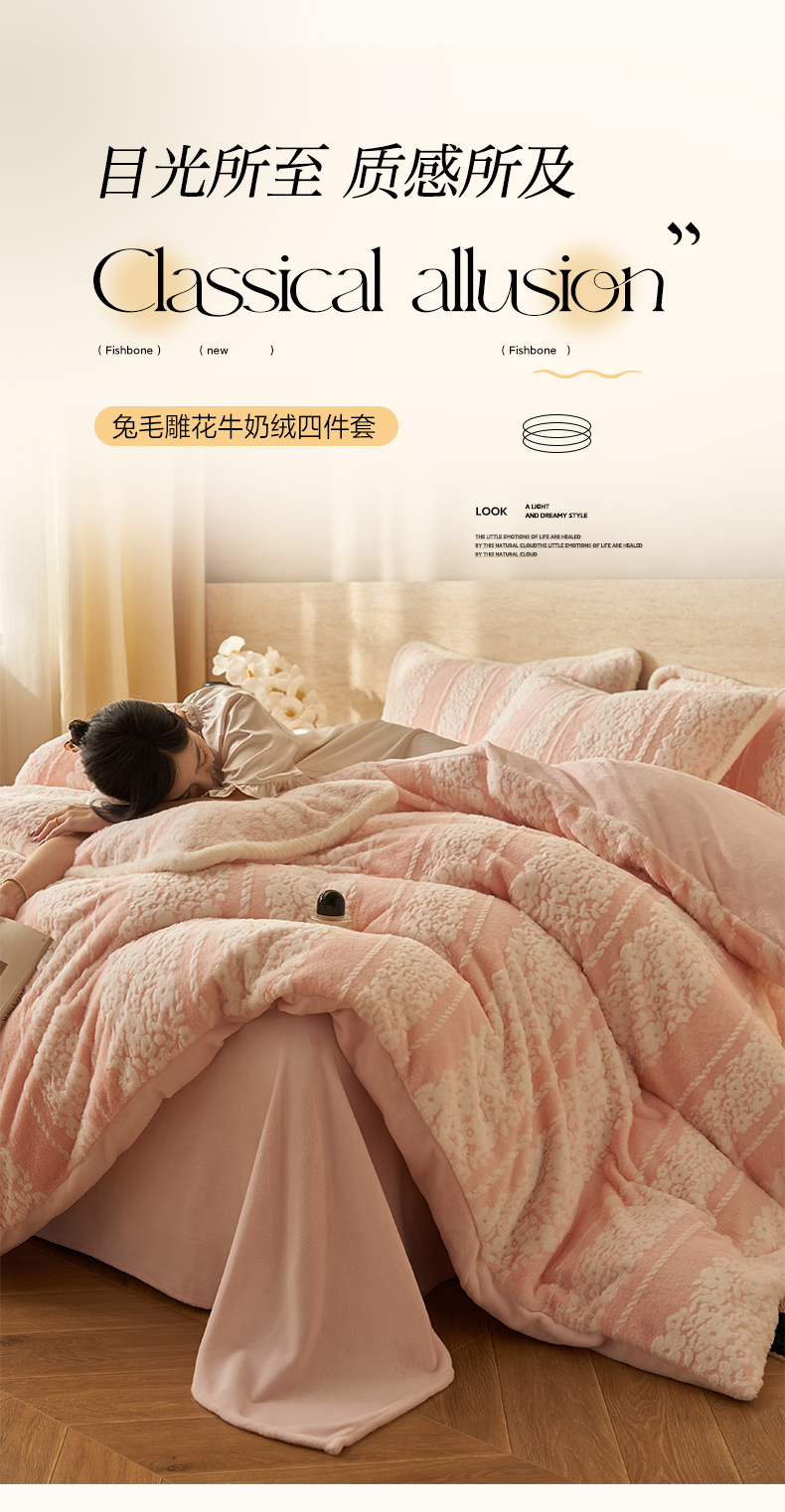 当前位置: 91家纺网 > 商品网购 > 床品套件 > 四件套 > 雕花绒四件套 > 寐绸家纺 2025秋冬新款350g兔毛雕花牛奶绒四件套 风铃