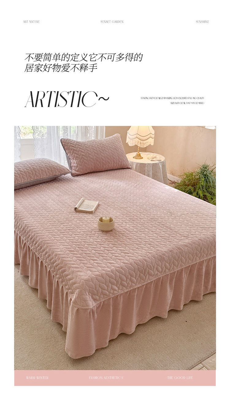 (总)野合家纺 2025新款牛奶绒夹棉床盖床裙款三件套-树叶,树叶-粉,树叶-灰,树叶-咖,树叶-兰,树叶-绿