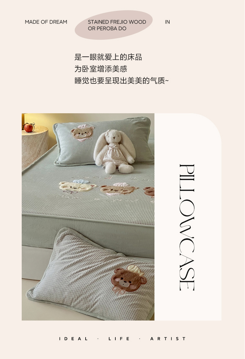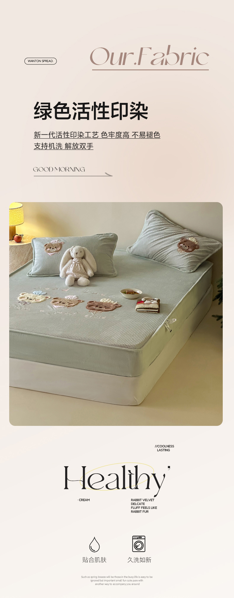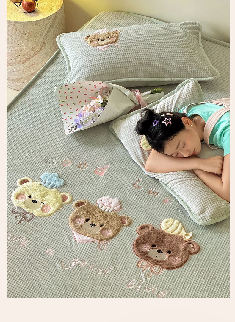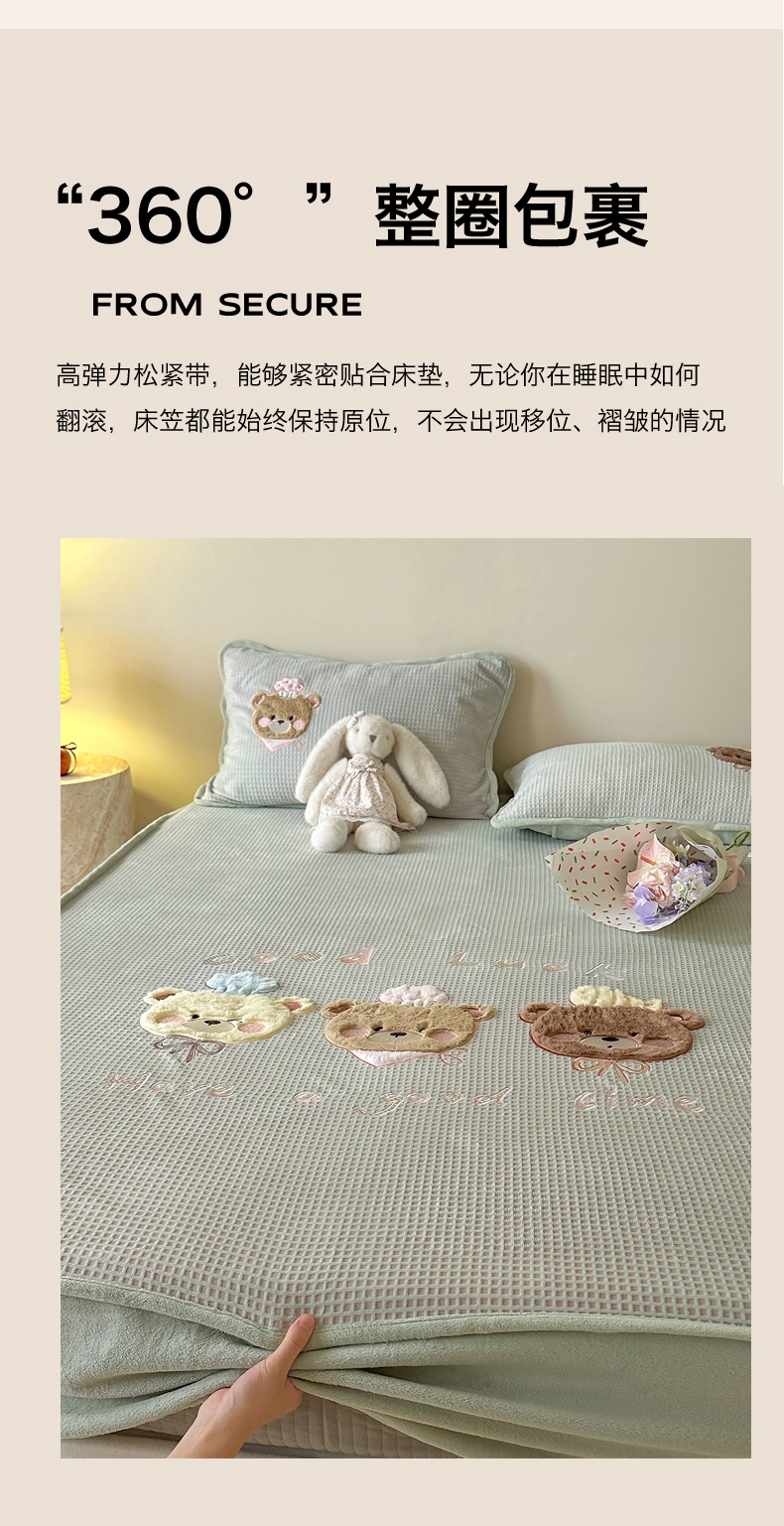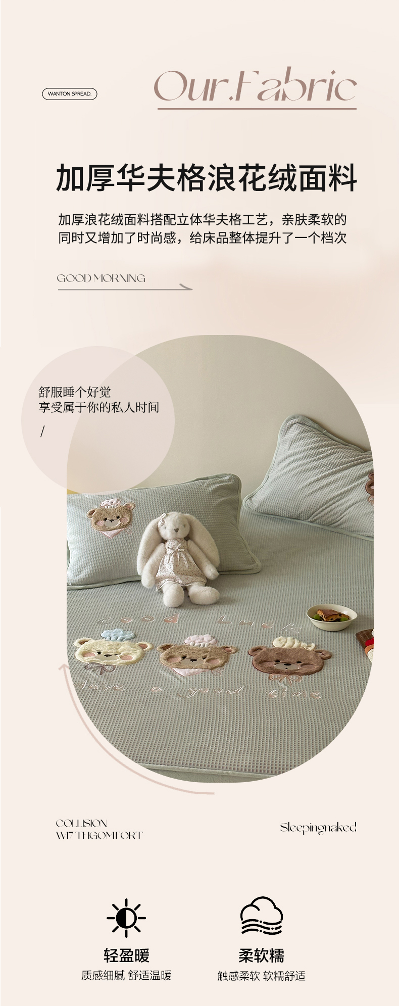商品名称:Sweet dreams甜梦 2025新款华夫格绒兔毛贴布床笠三件套 三只小熊绿