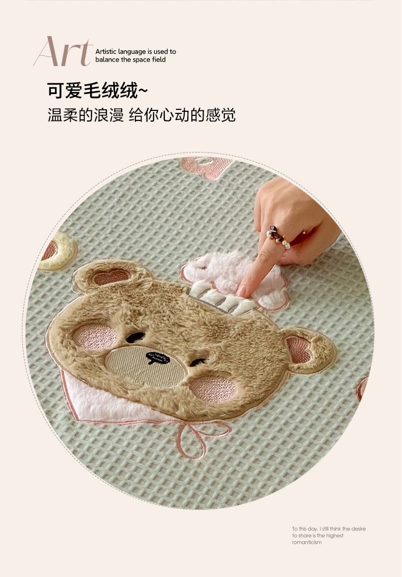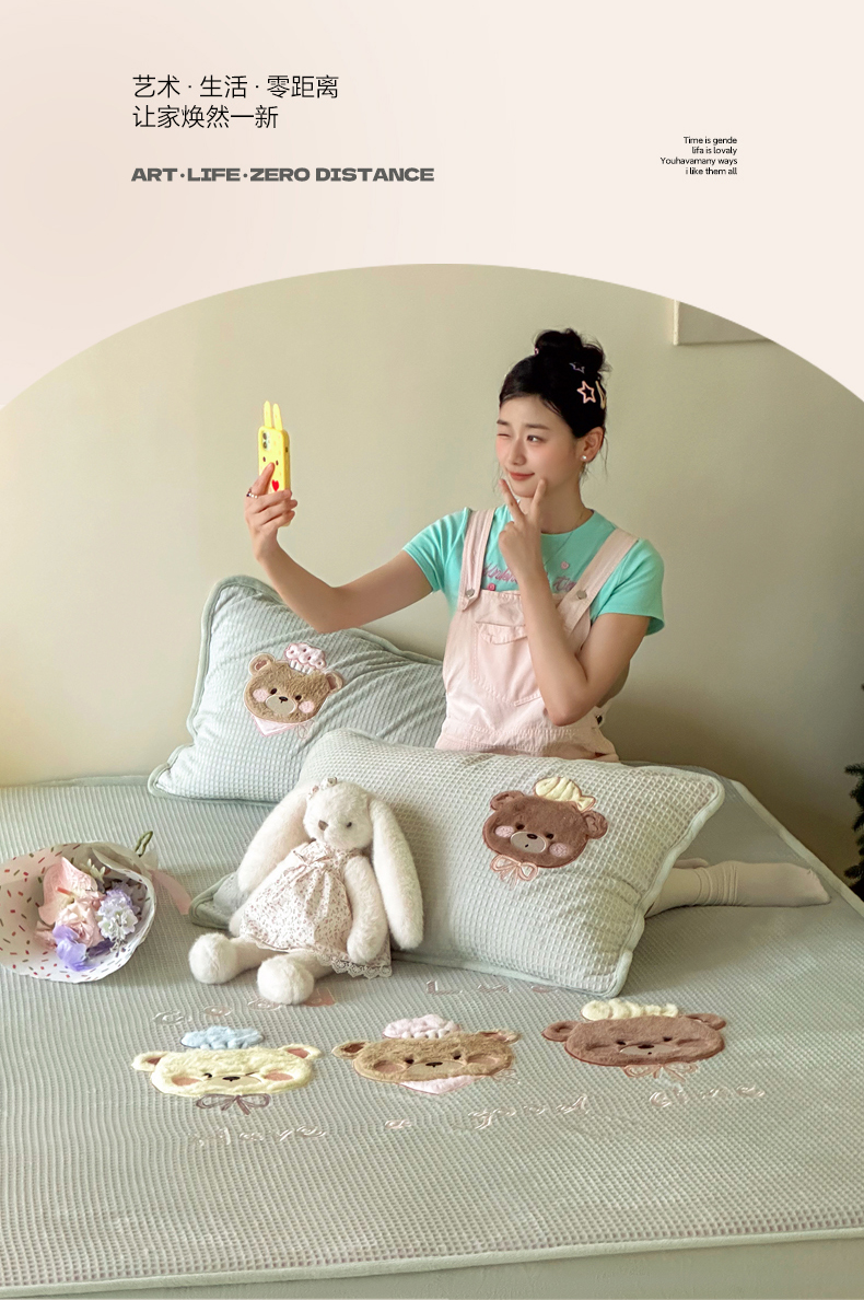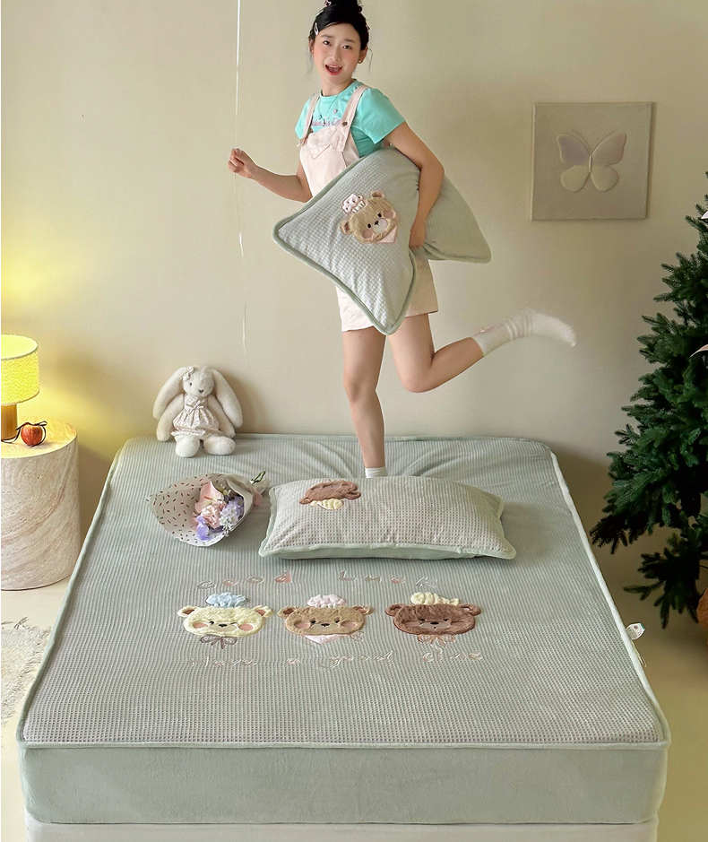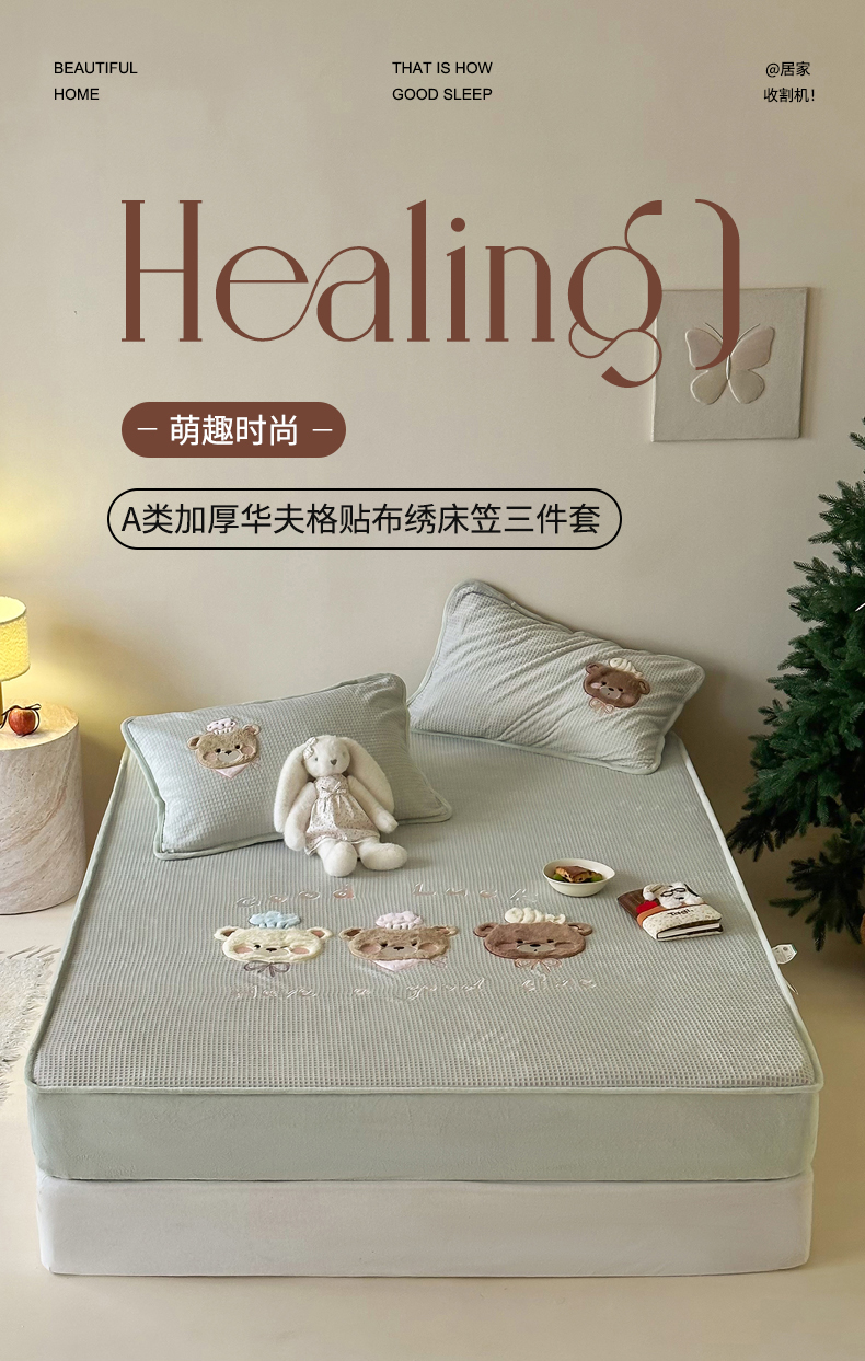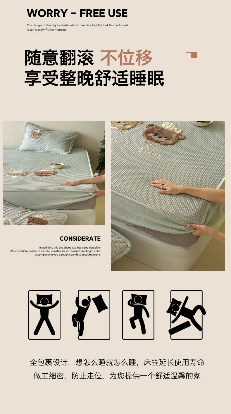 商品名称:Sweet dreams甜梦 2025新款华夫格绒兔毛贴布床笠三件套 三只小熊绿
