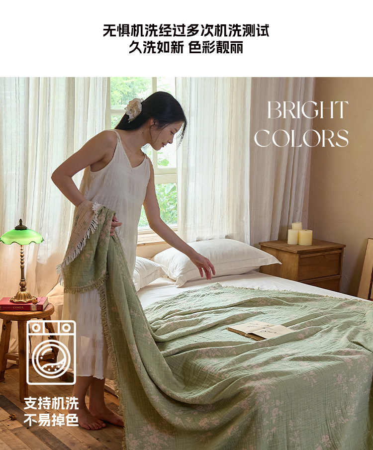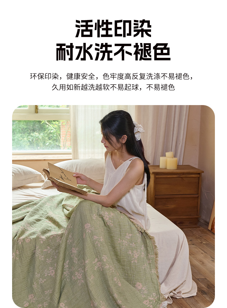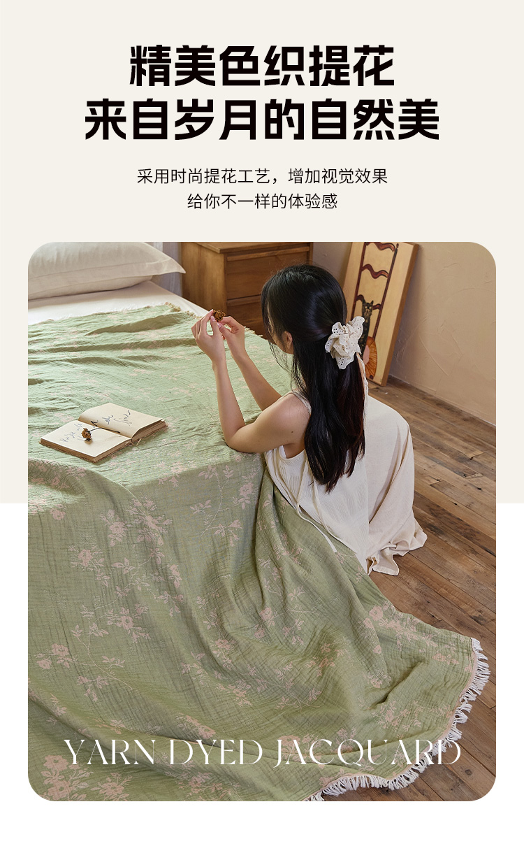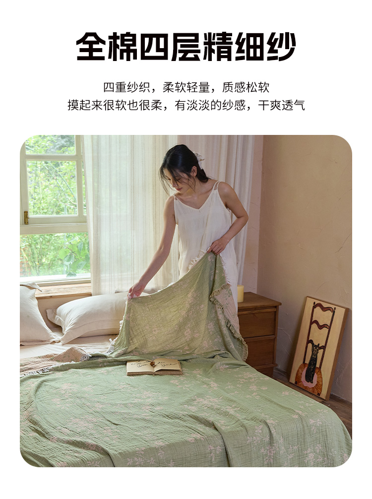 商品名称:沐瑟家纺 2025新款四层纱布全棉流苏毯子纱布床盖毛巾被纯棉棉纱夏凉被午睡盖毯 花湉-绿色