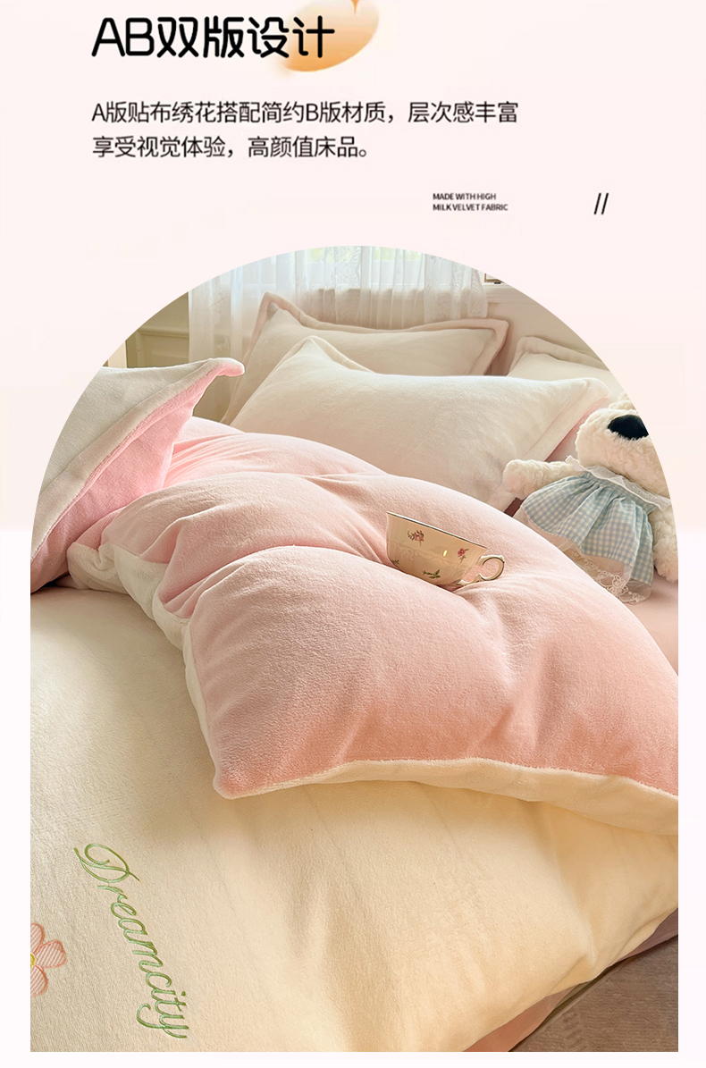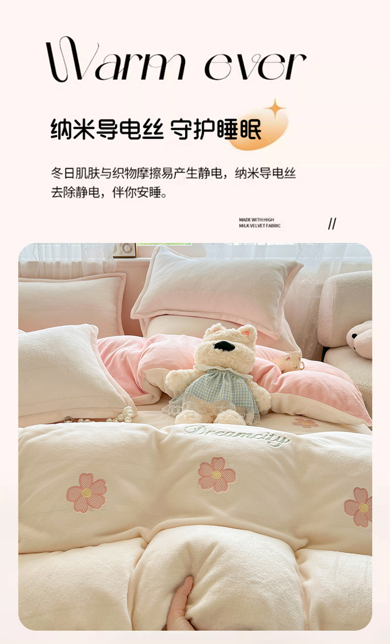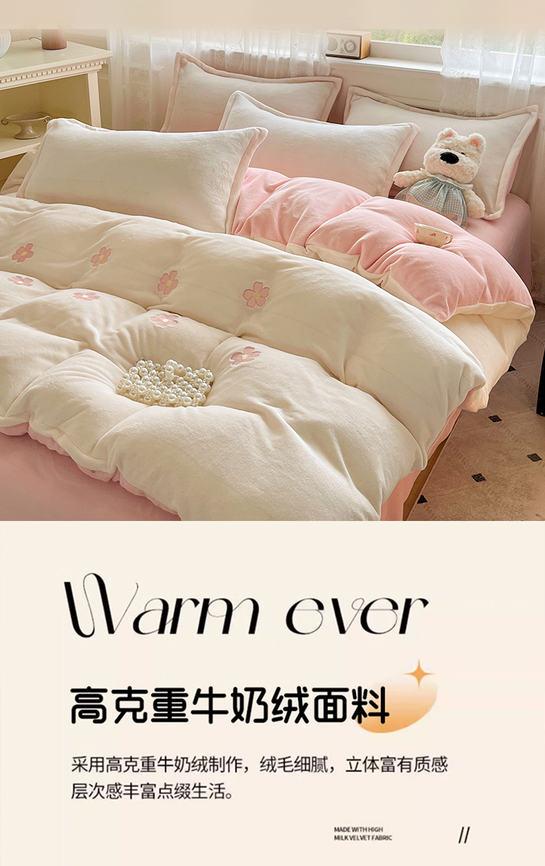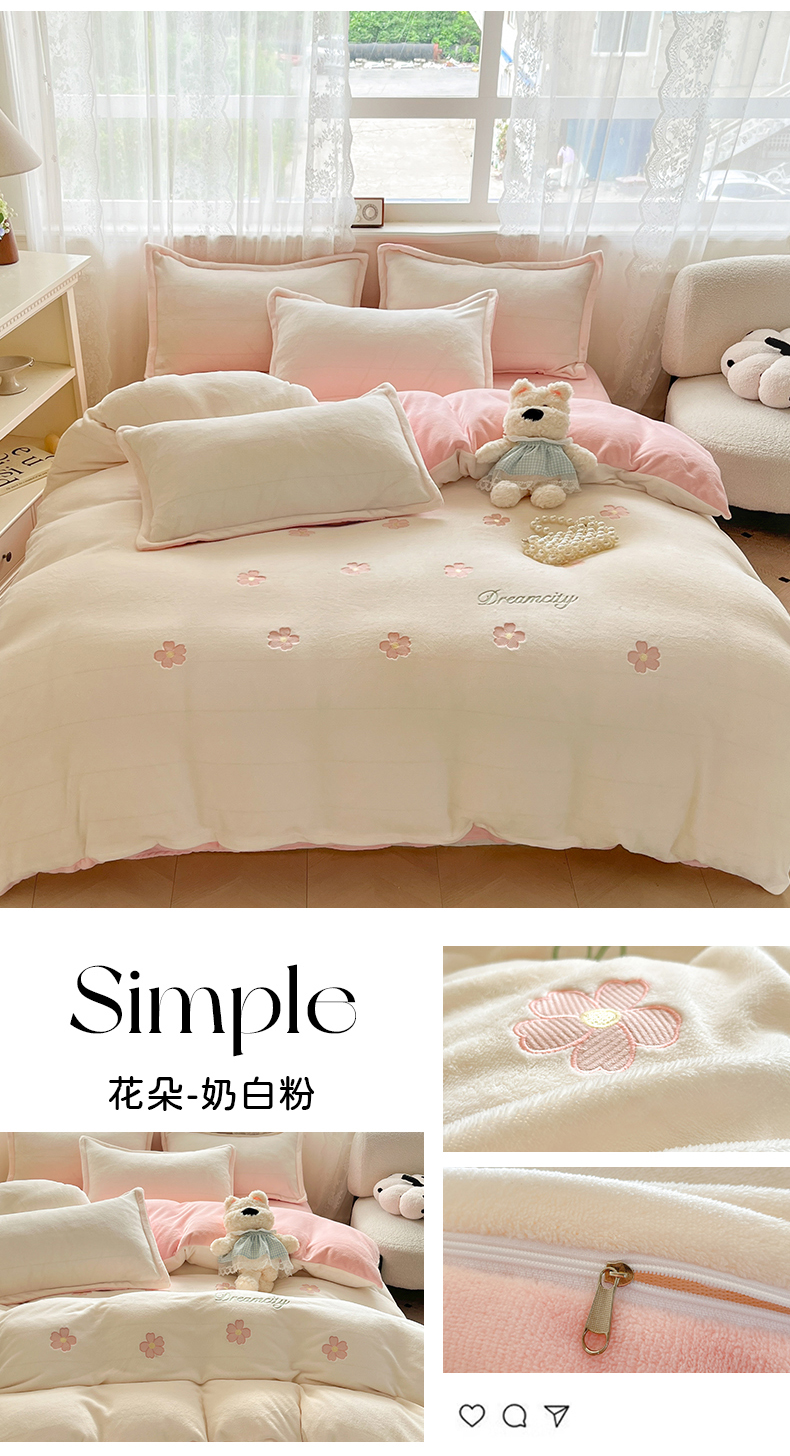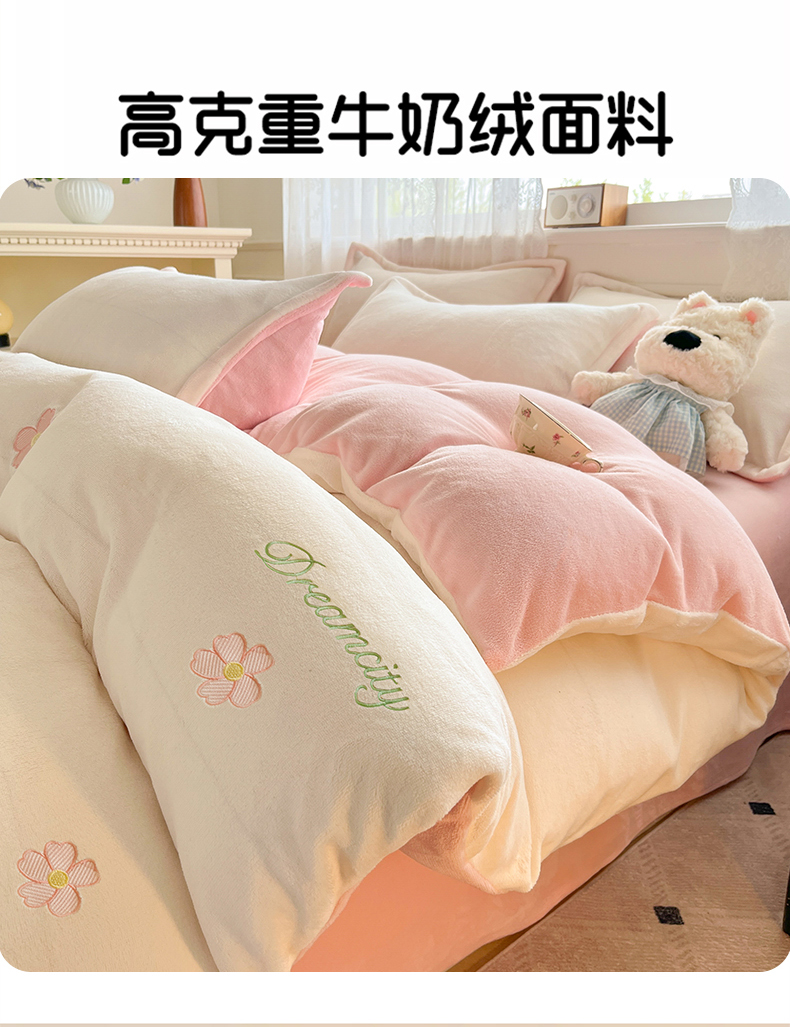 商品名称:伊梵居2025新款加厚贴布绣牛奶绒四件套 花朵-奶白粉