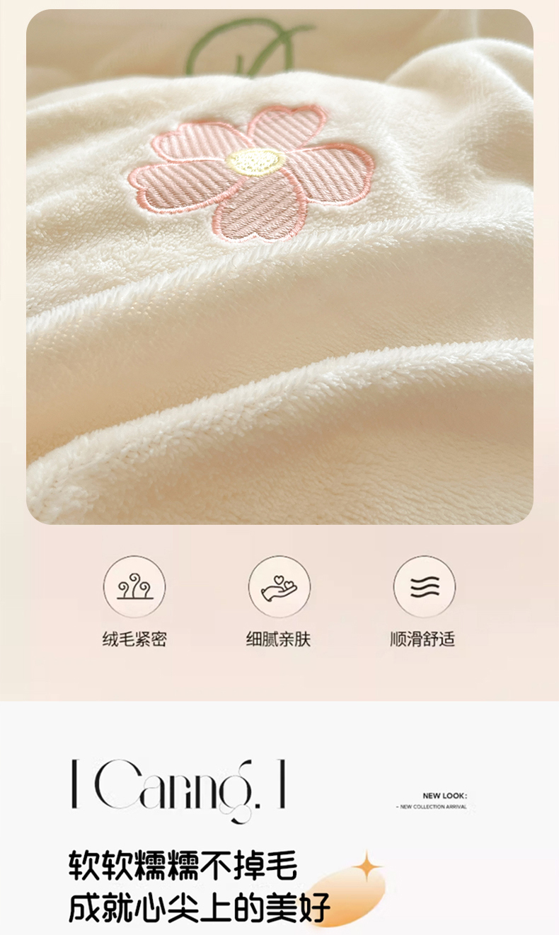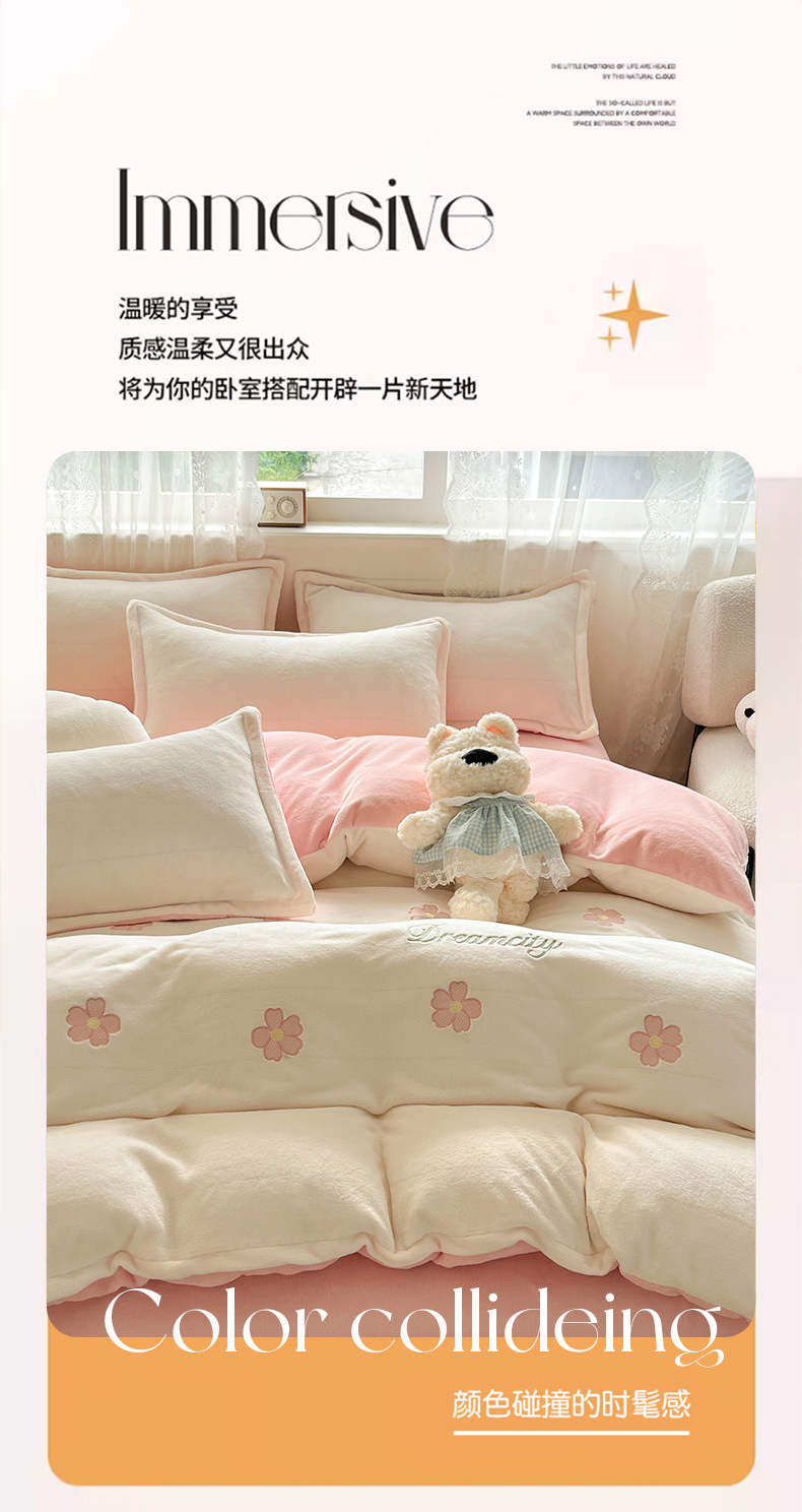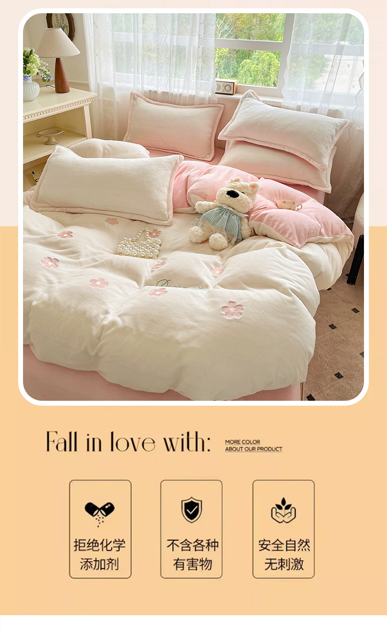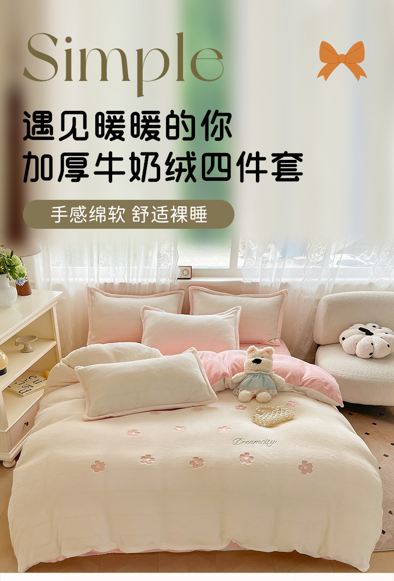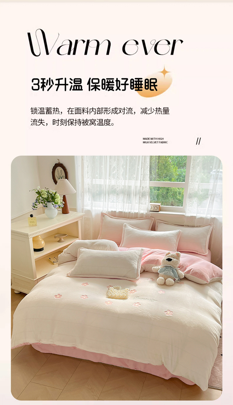 商品名称:伊梵居2025新款加厚贴布绣牛奶绒四件套 花朵-奶白粉