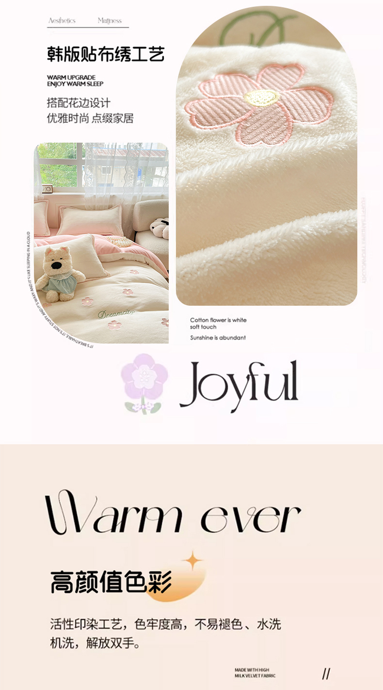 伊梵居2025新款加厚贴布绣牛奶绒四件套 花朵-奶白粉