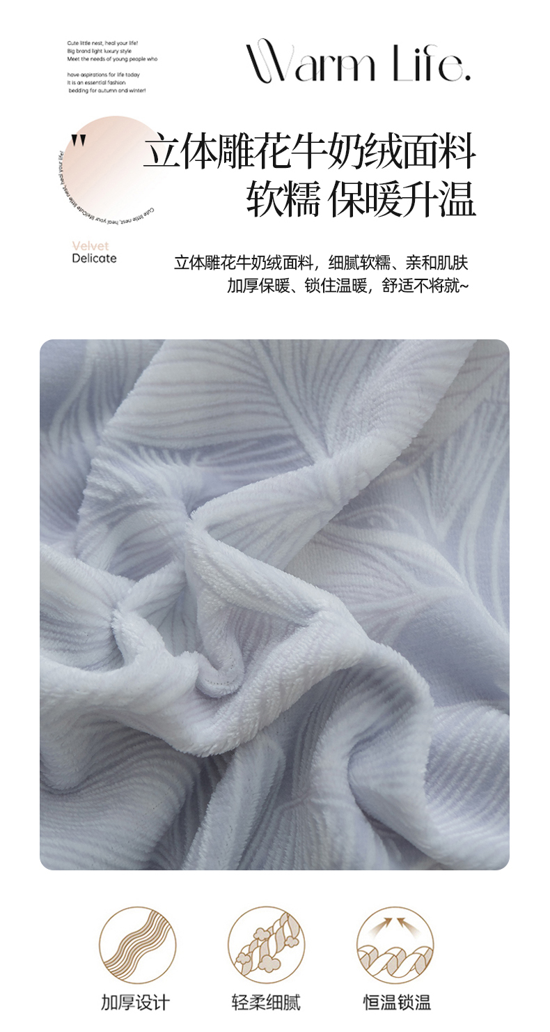 商品名称:米奈家居 2025新款立体雕花拼角款牛奶绒四件套 秋影-灰蓝
