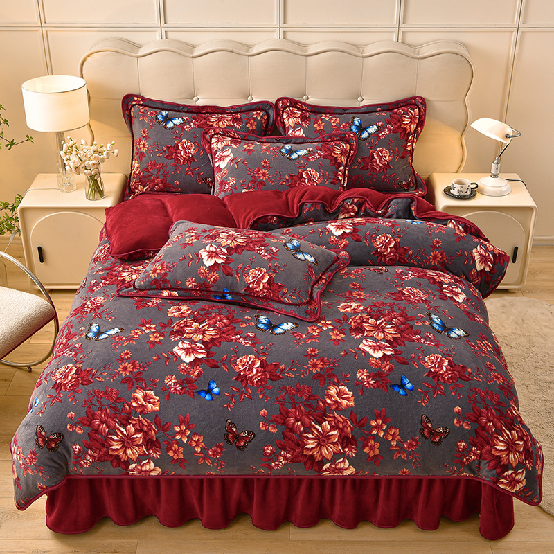 商品名称:赛丽雅 2025新款牛奶绒床裙四件套8-9斤法莱绒直播爆款日产2万套 蝶舞-红