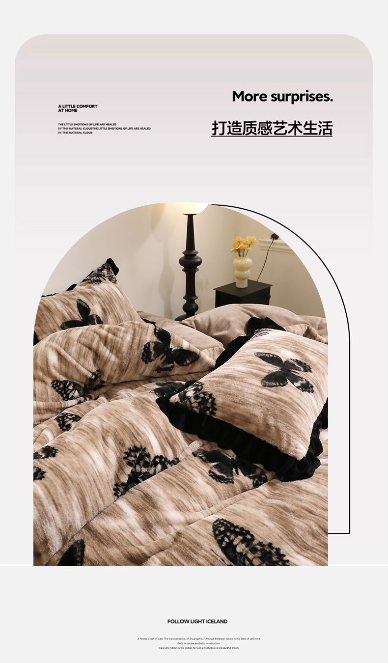 席之家 2025新款韩版黑色花边美拉德系加厚皮草兔毛绒四件套 蝶舞