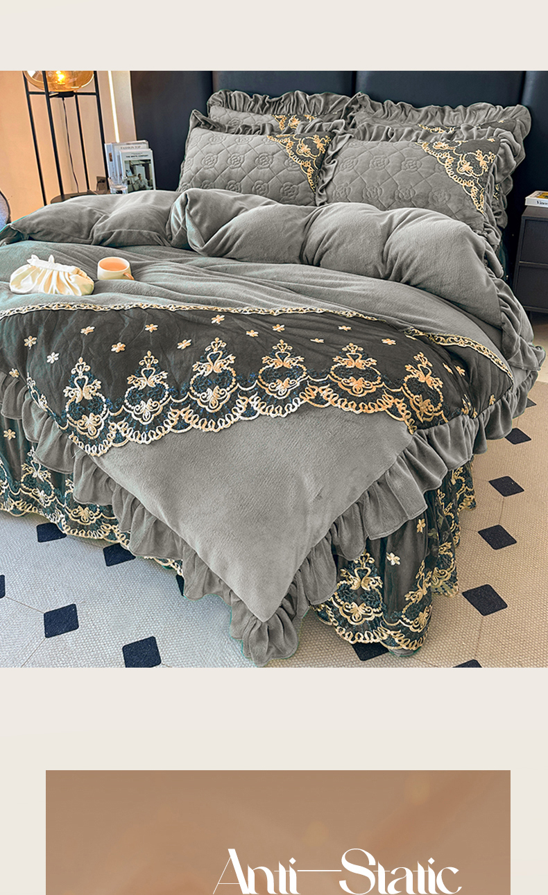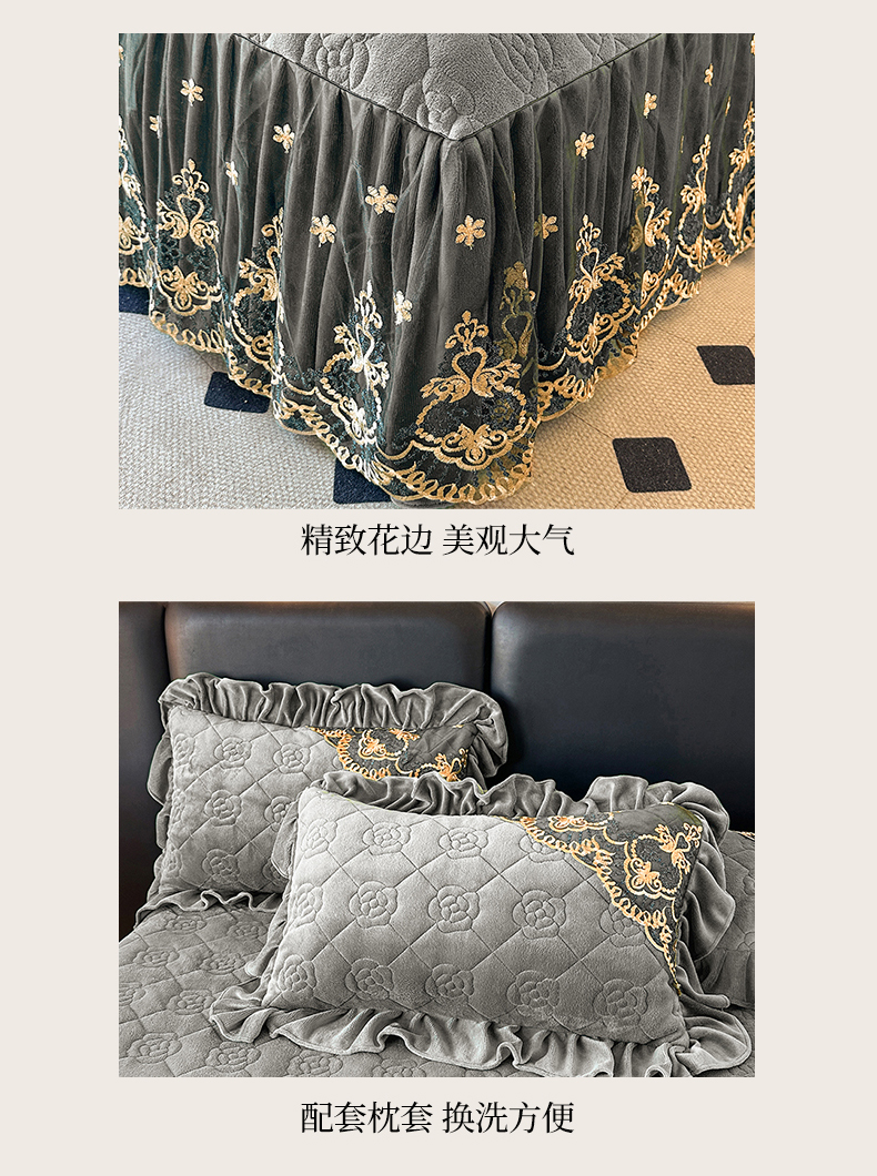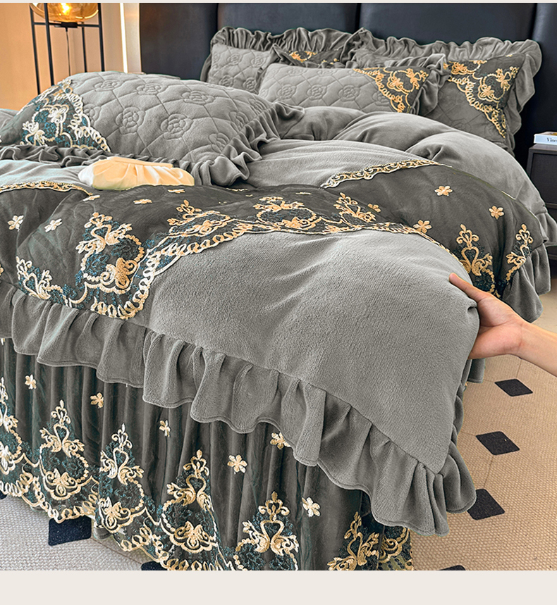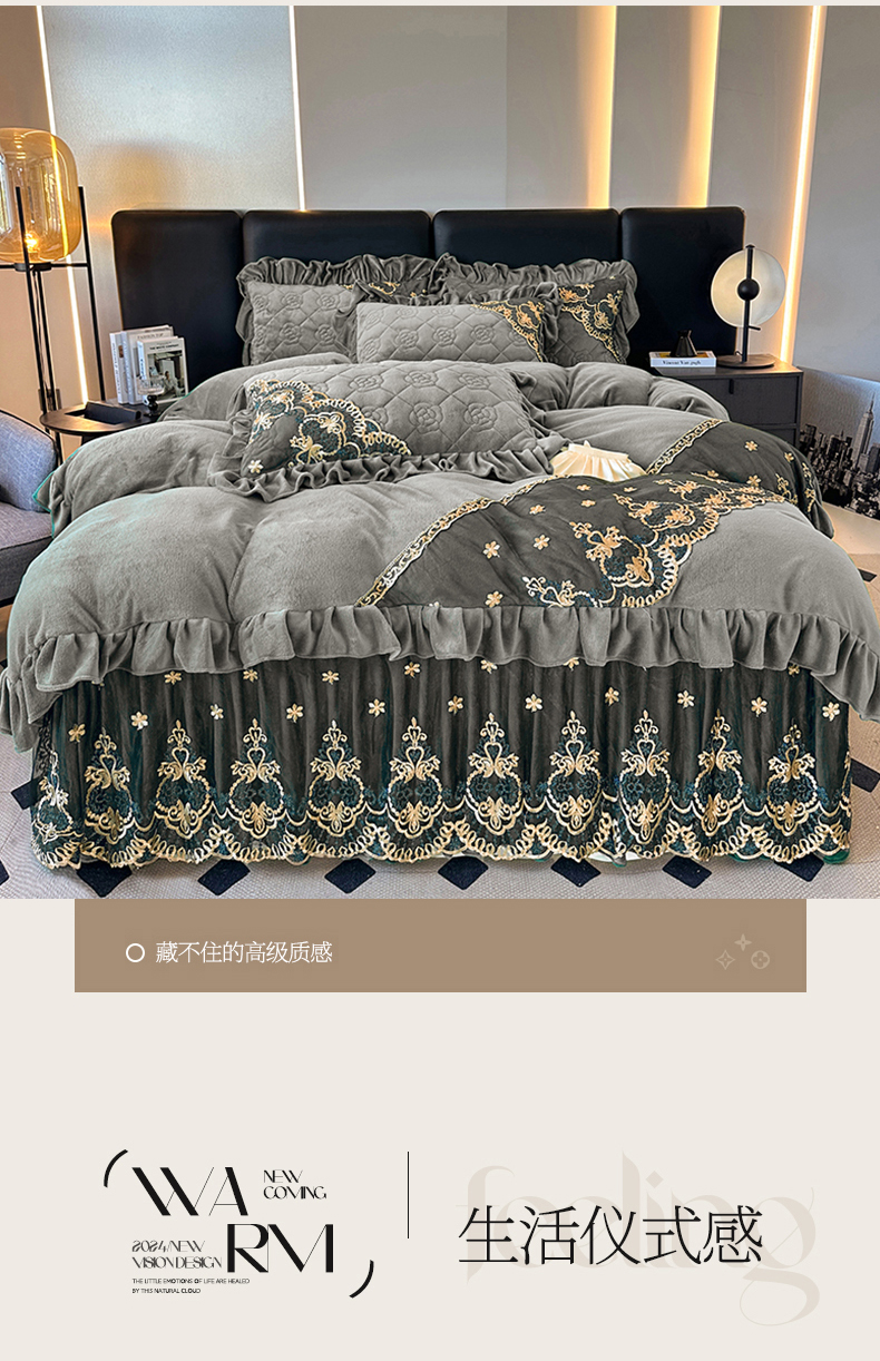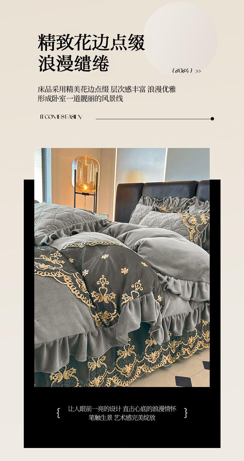 当前位置: 91家纺网 > 商品网购 > 床品套件 > 四件套 > 牛奶绒四件套 > 罗艺轩 2025新款牛奶绒浪漫花边床裙款四件套-暖洋洋(报活动和优惠券后控价99起/控价107起) 暖洋洋-灰