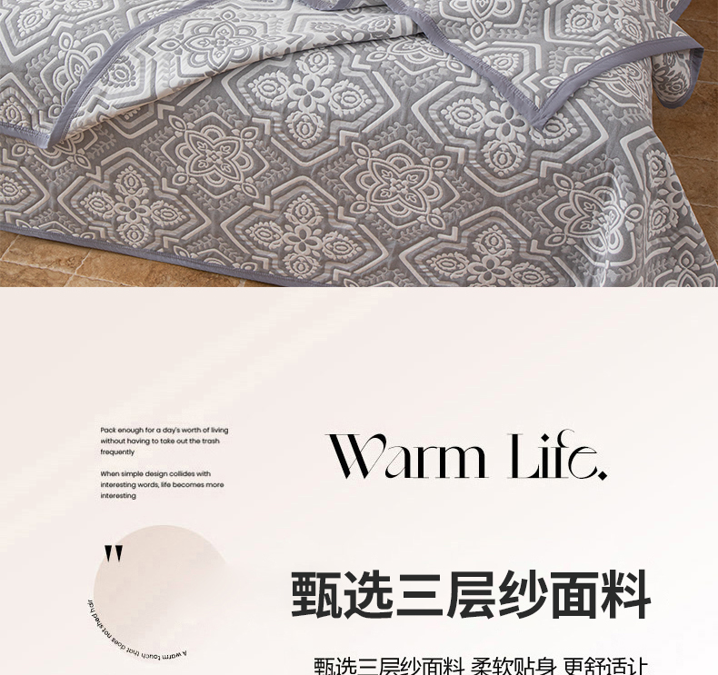 小叮当家纺仓储工厂店 (买家秀 爆款花型 不断货)2025新款A类三层纱纱布毛巾被单品床盖单件床盖 卡曼洛-锡器灰