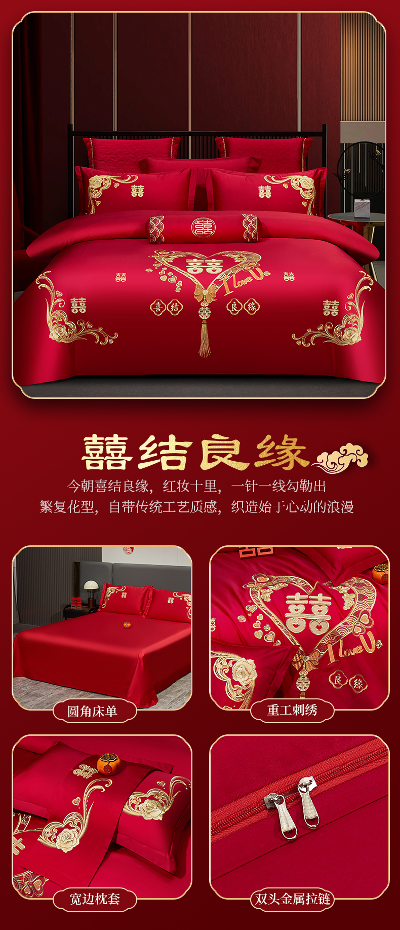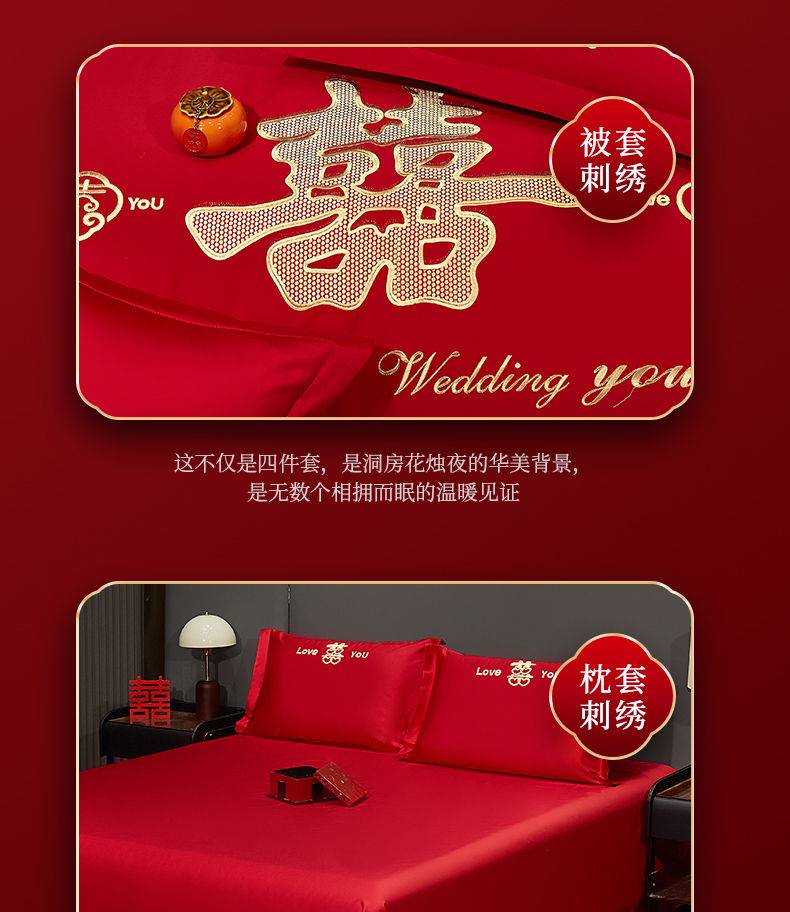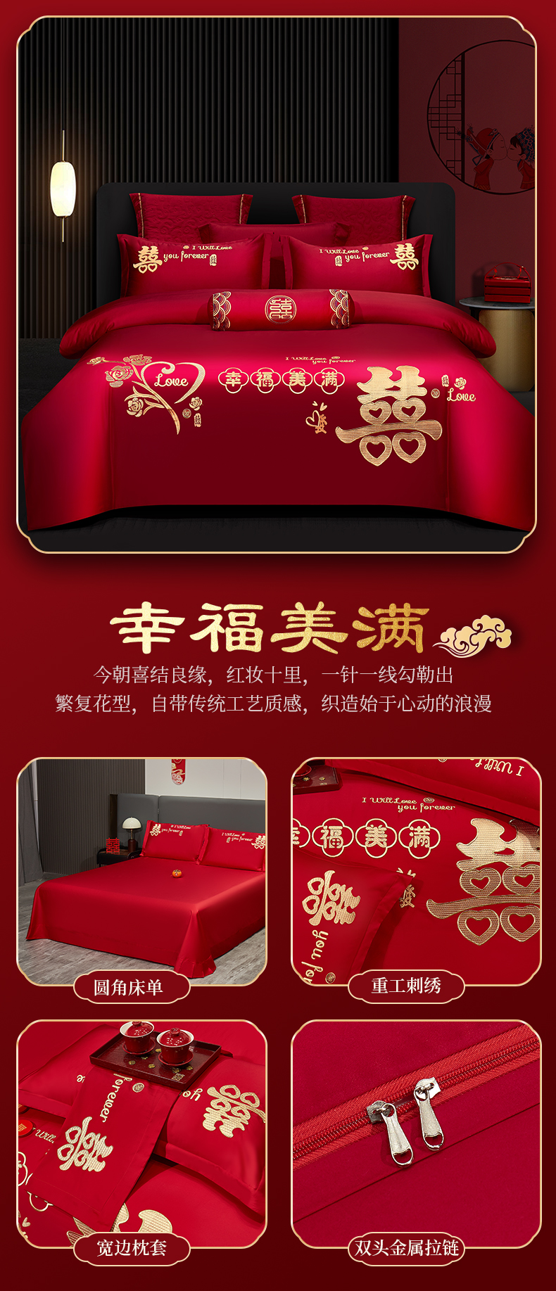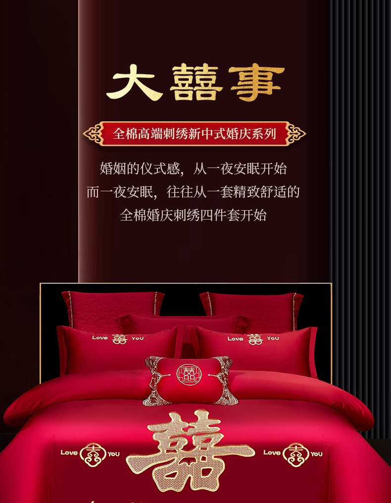 浩情国际婚庆供货中心 2026新款100%全棉纯棉新中式刺绣大红结婚婚庆四件套多件套 HQ-大囍事