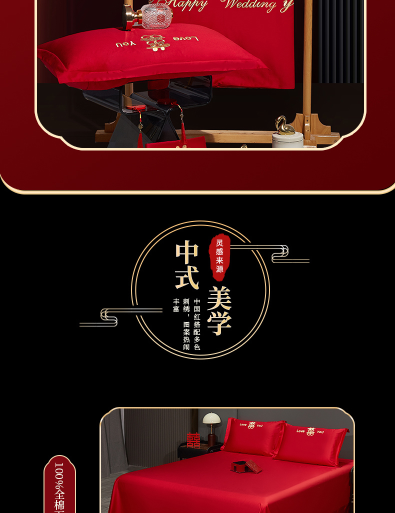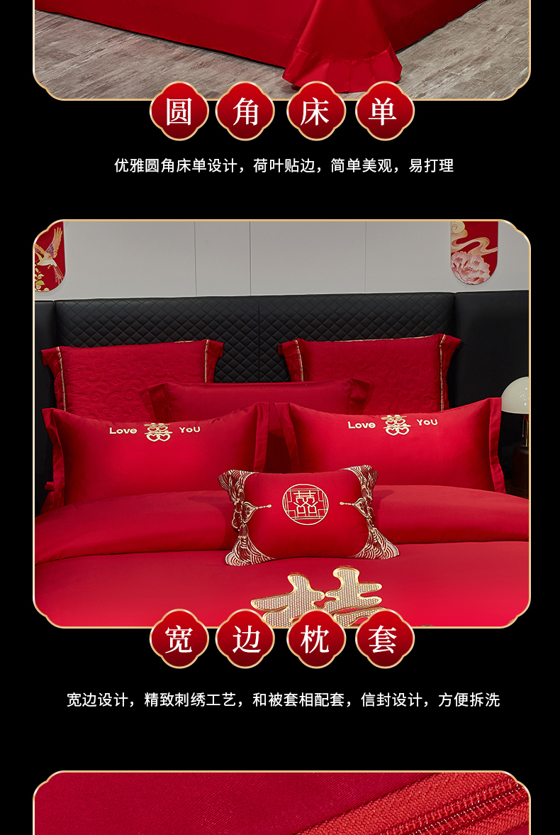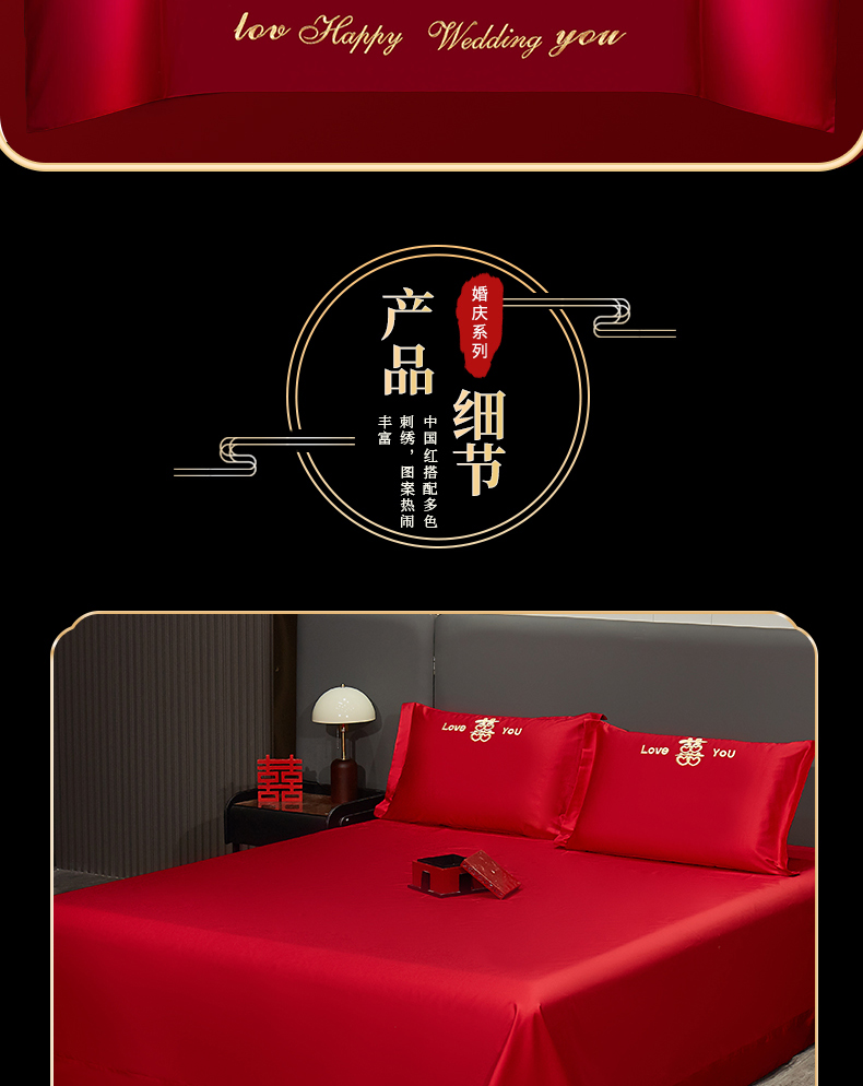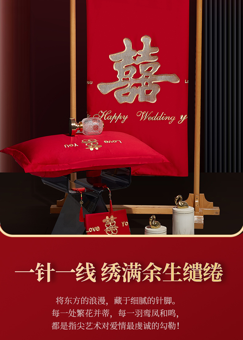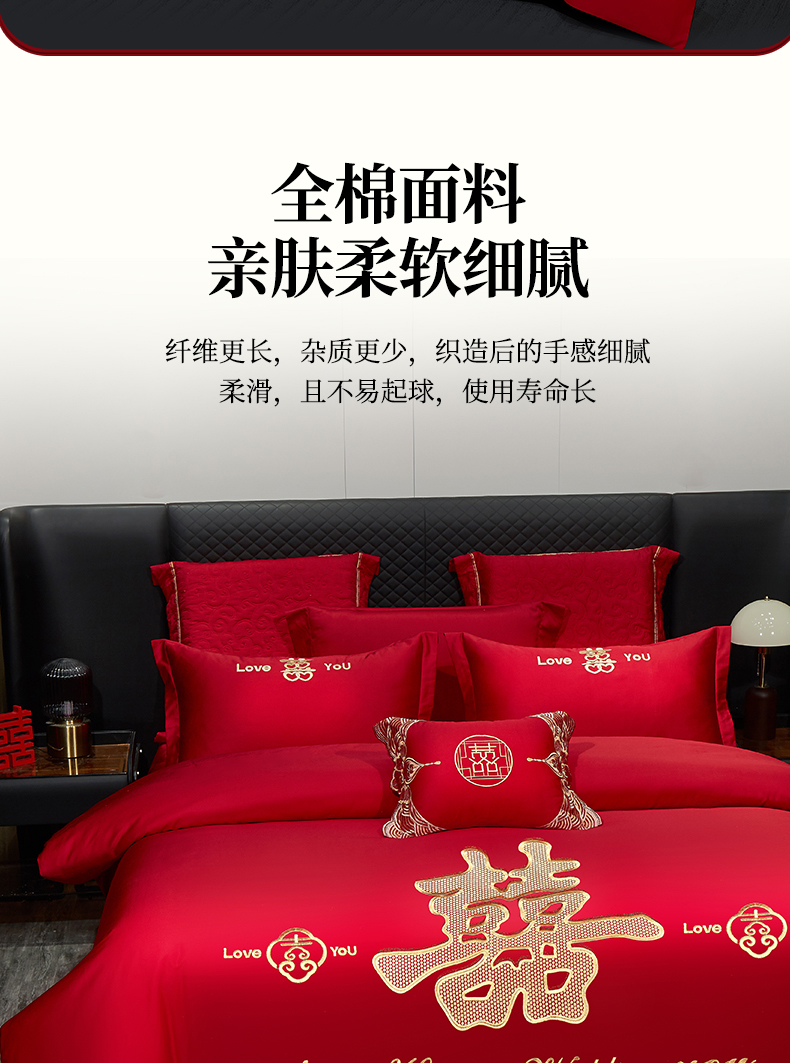 浩情国际婚庆供货中心 2026新款100%全棉纯棉新中式刺绣大红结婚婚庆四件套多件套 HQ-大囍事