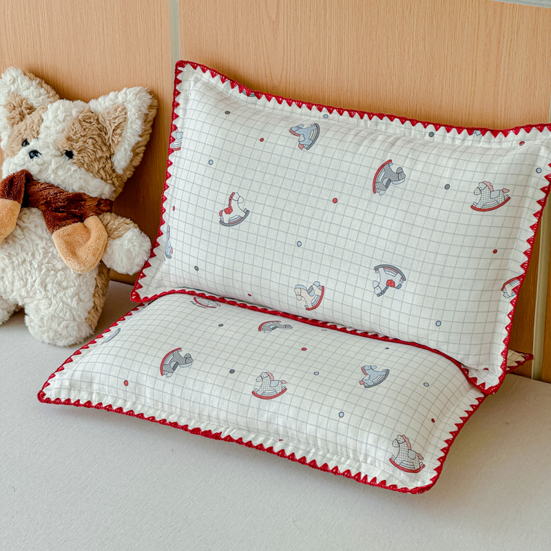 商品名称:金丝鸟家纺 2026新款全棉双层纱贝壳边款枕套多规格儿童枕套 木马旧梦