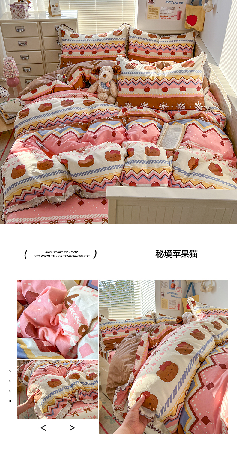 当前位置: 91家纺网 > 商品网购 > 床品套件 > 四件套 > 全棉普通四件套 > 希诺家居 2025新款费尔岛风全棉纯棉四件套韩式小清新花边四件套 秘境苹果猫