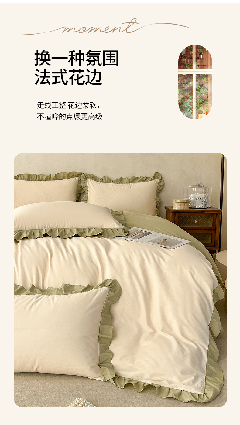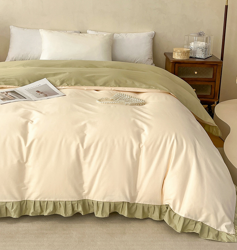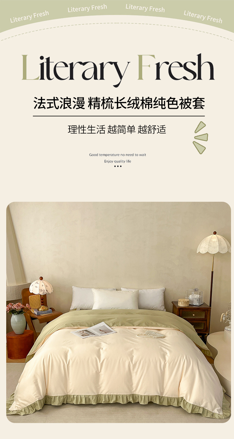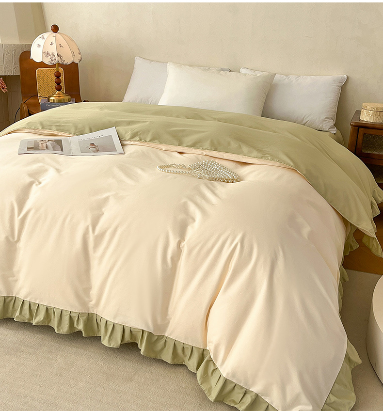 • 91家纺网 家纺一手货源 找家纺 艾迪尚家纺 2026法式韩版荷叶边纯色长绒棉纯棉单被套 茉绿奶芙