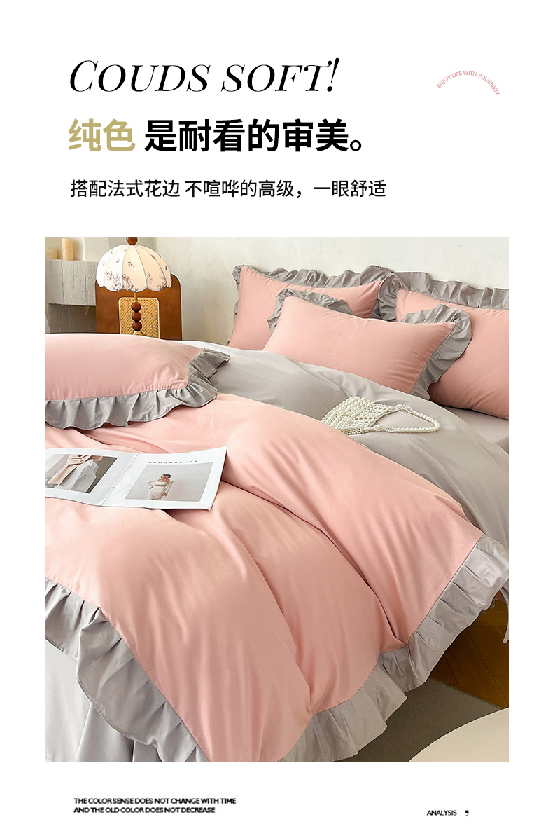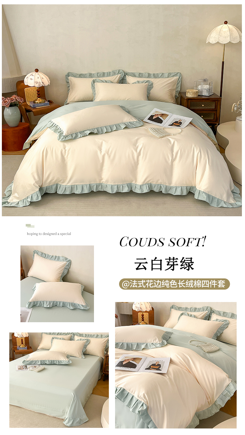 当前位置: 91家纺网 > 商品网购 > 床品套件 > 四件套 > 全棉普通四件套 > 艾迪尚家纺 2026新款法式韩版荷叶边纯色长绒棉四件套 柔杏浅绿