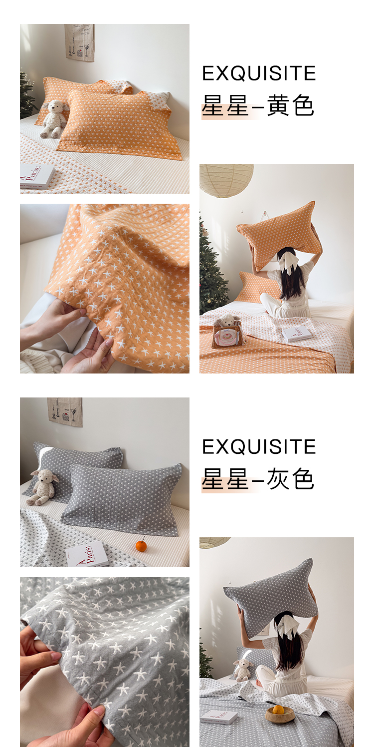 (总)沐瑟家纺 2026新款全棉四层纱布床盖-星星和心情系列,心情-粉色,心情-灰蓝,心情-卡其,星星-黄色,星星-灰色,星星-蓝色,星星-紫色,组合