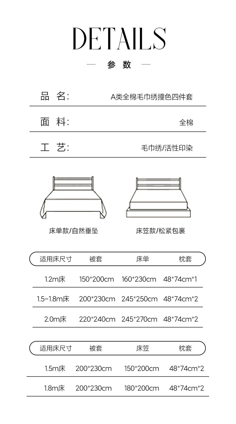 [{"sp_id":11,"sp_name":"\u989c\u8272","sp_format":2,"sp_list":[{"sp_value_id":1667,"sp_value_name":"\u83f1\u82b1\u767d+\u6d45\u5361\u5176","sp_value_image":{"id":999,"path":"https:\/\/img3.91jf.com\/ghelp\/2026\/20260125\/20260125134143_434908.jpg"},"sp_value_video":{"id":0,"img":"","path":"","time":0,"download_num":0,"play_num":0},"price":"80.00","storage":2500,"weight":"2.100","is_check_weight":0,"plus_price":"","sp_sort":0}]},{"sp_id":10,"sp_name":"\u5c3a\u5bf8","sp_format":1,"sp_list":[{"sp_value_id":41,"sp_value_name":"1.2m\u5e8a\u5355\u6b3e\u4e09\u4ef6\u5957","sp_value_image":{"id":0,"path":""},"sp_value_video":{"id":0,"img":"","path":"","time":0,"download_num":0,"play_num":0},"price":"80.00","storage":0,"weight":"2.100","is_check_weight":0,"plus_price":"","sp_sort":5},{"sp_value_id":42,"sp_value_name":"1.5m\u5e8a\u5355\u6b3e\u56db\u4ef6\u5957","sp_value_image":{"id":0,"path":""},"sp_value_video":{"id":0,"img":"","path":"","time":0,"download_num":0,"play_num":0},"price":"115.00","storage":500,"weight":"2.300","is_check_weight":0,"plus_price":"","sp_sort":6},{"sp_value_id":43,"sp_value_name":"1.8m\u5e8a\u5355\u6b3e\u56db\u4ef6\u5957","sp_value_image":{"id":0,"path":""},"sp_value_video":{"id":0,"img":"","path":"","time":0,"download_num":0,"play_num":0},"price":"115.00","storage":500,"weight":"2.300","is_check_weight":0,"plus_price":"","sp_sort":7},{"sp_value_id":44,"sp_value_name":"2.0m\u5e8a\u5355\u6b3e\u56db\u4ef6\u5957","sp_value_image":{"id":0,"path":""},"sp_value_video":{"id":0,"img":"","path":"","time":0,"download_num":0,"play_num":0},"price":"125.00","storage":500,"weight":"2.500","is_check_weight":0,"plus_price":"","sp_sort":8},{"sp_value_id":45,"sp_value_name":"1.5m\u5e8a\u7b20\u6b3e\u56db\u4ef6\u5957","sp_value_image":{"id":0,"path":""},"sp_value_video":{"id":0,"img":"","path":"","time":0,"download_num":0,"play_num":0},"price":"125.00","storage":500,"weight":"2.800","is_check_weight":0,"plus_price":"","sp_sort":9},{"sp_value_id":736,"sp_value_name":"1.8m\u5e8a\u7b20\u6b3e\u56db\u4ef6\u5957","sp_value_image":{"id":0,"path":""},"sp_value_video":{"id":0,"img":"","path":"","time":0,"download_num":0,"play_num":0},"price":"125.00","storage":500,"weight":"2.800","is_check_weight":0,"plus_price":"","sp_sort":10}]}]