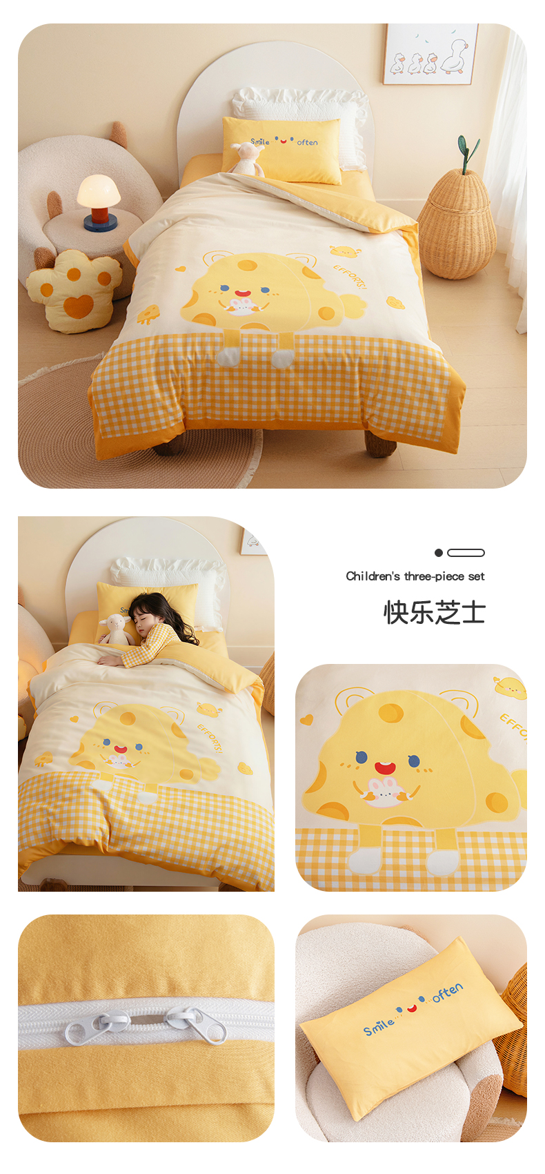 (总)2025款A类全棉水洗棉贴布绣四件套全棉卡通儿童三件套公主上下铺床套件,开心芝士,长耳兔,小鳄莱莱,彩虹鸭,宇航梦