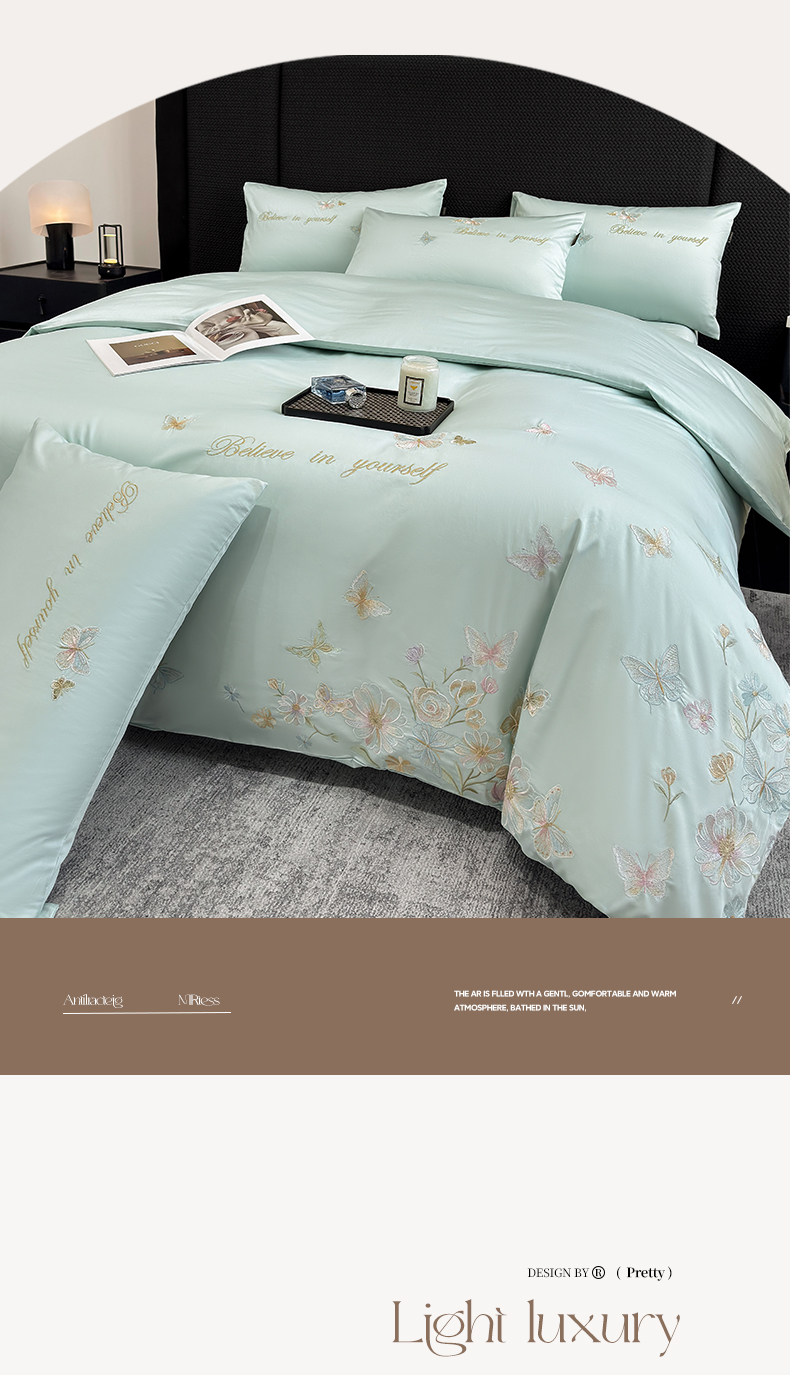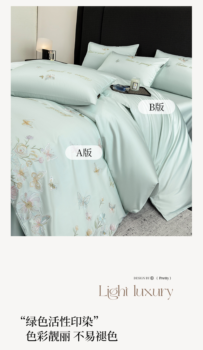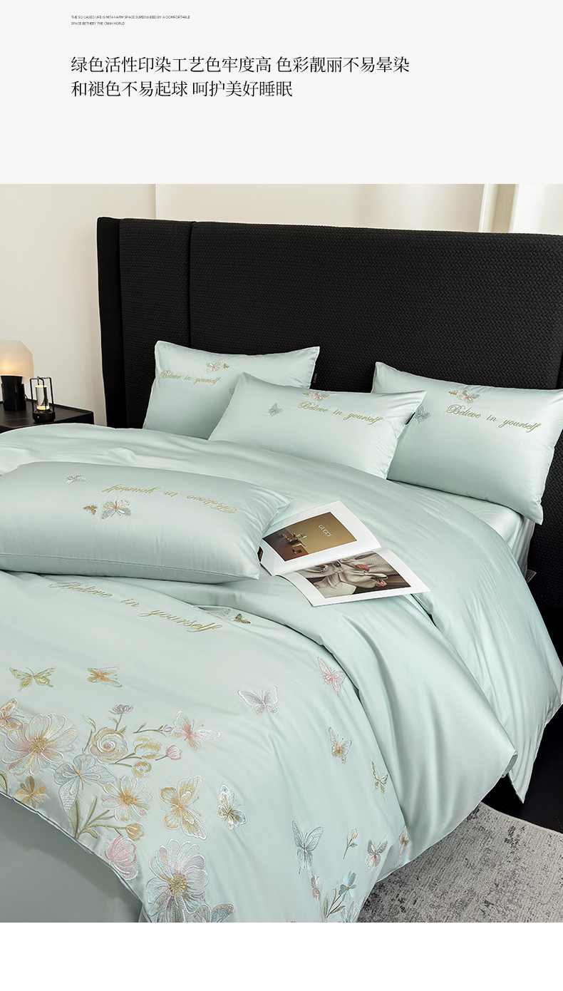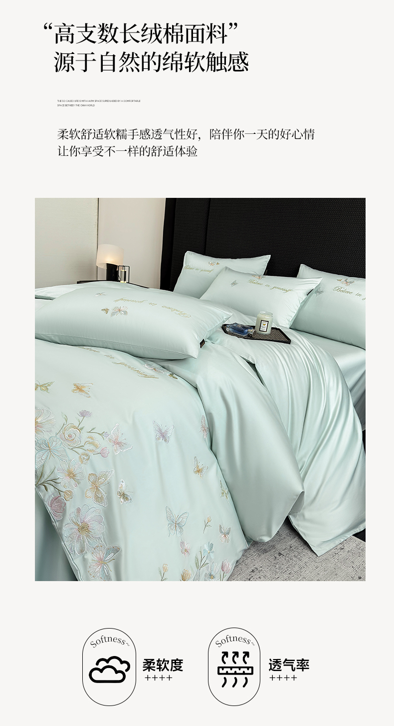 当前位置: 91家纺网 > 商品网购 > 床品套件 > 四件套 > 长绒棉四件套 > 欣宜家纺 2026新款50x50s纯棉全棉贡缎长绒棉刺绣绣花四件套【高端礼盒】-蝴蝶泉边 蝴蝶泉边-清新绿