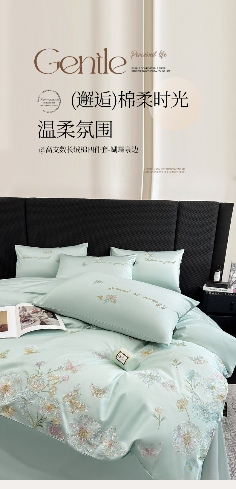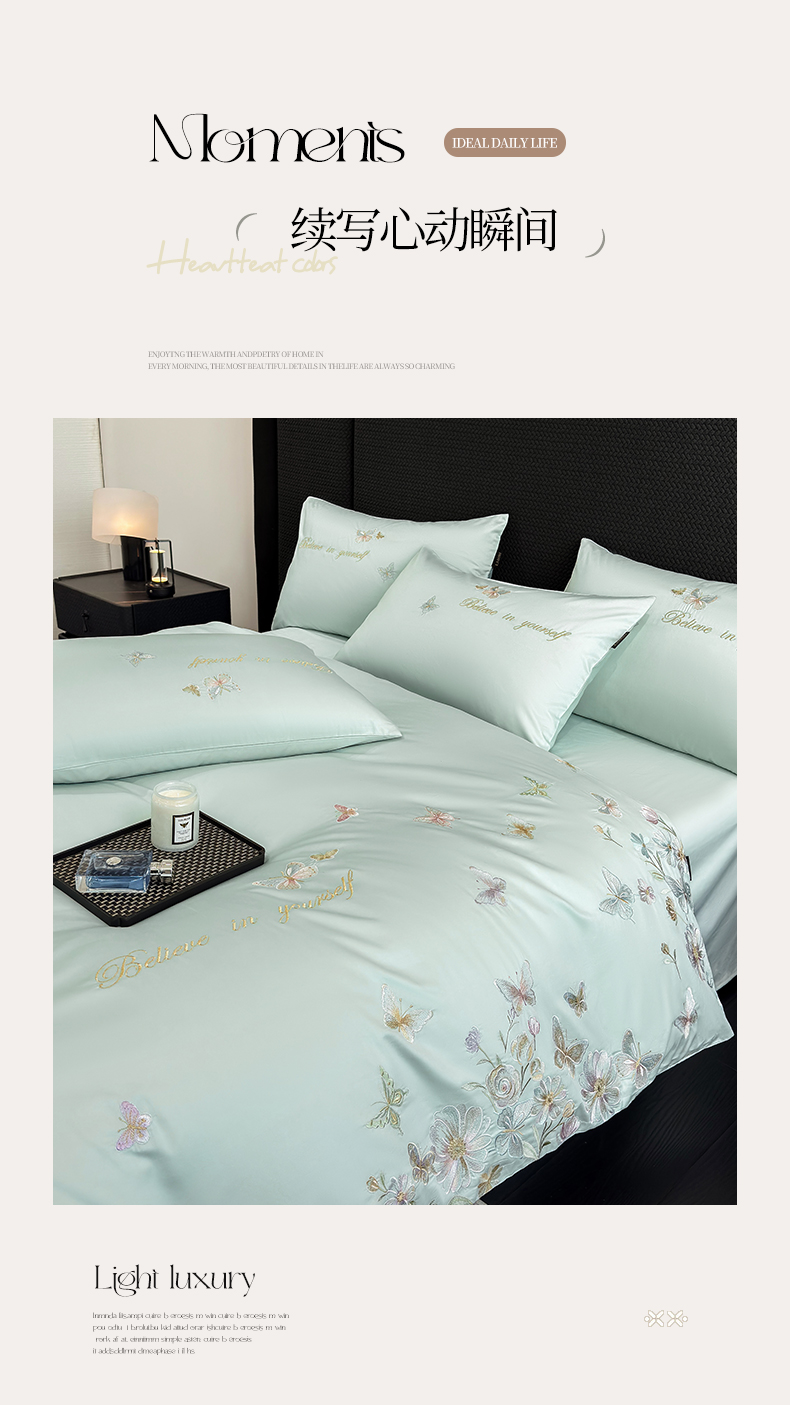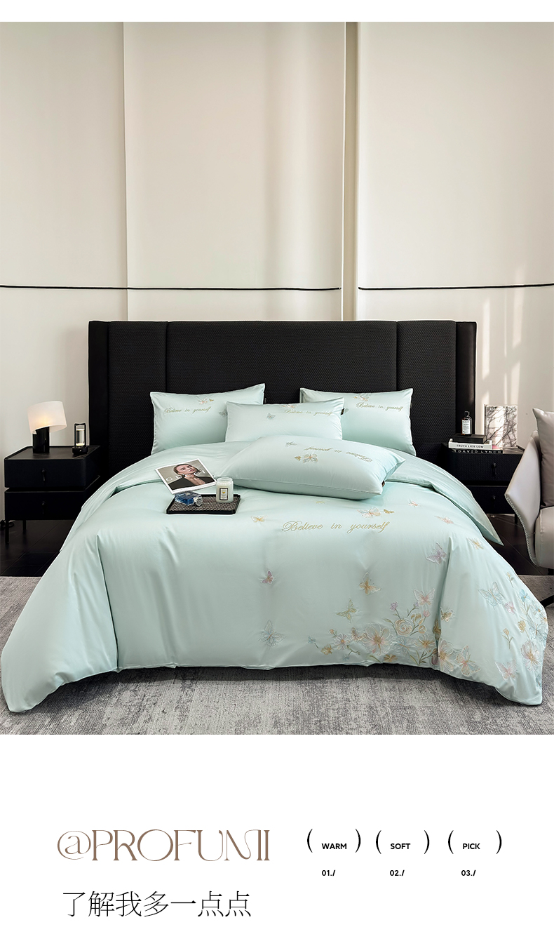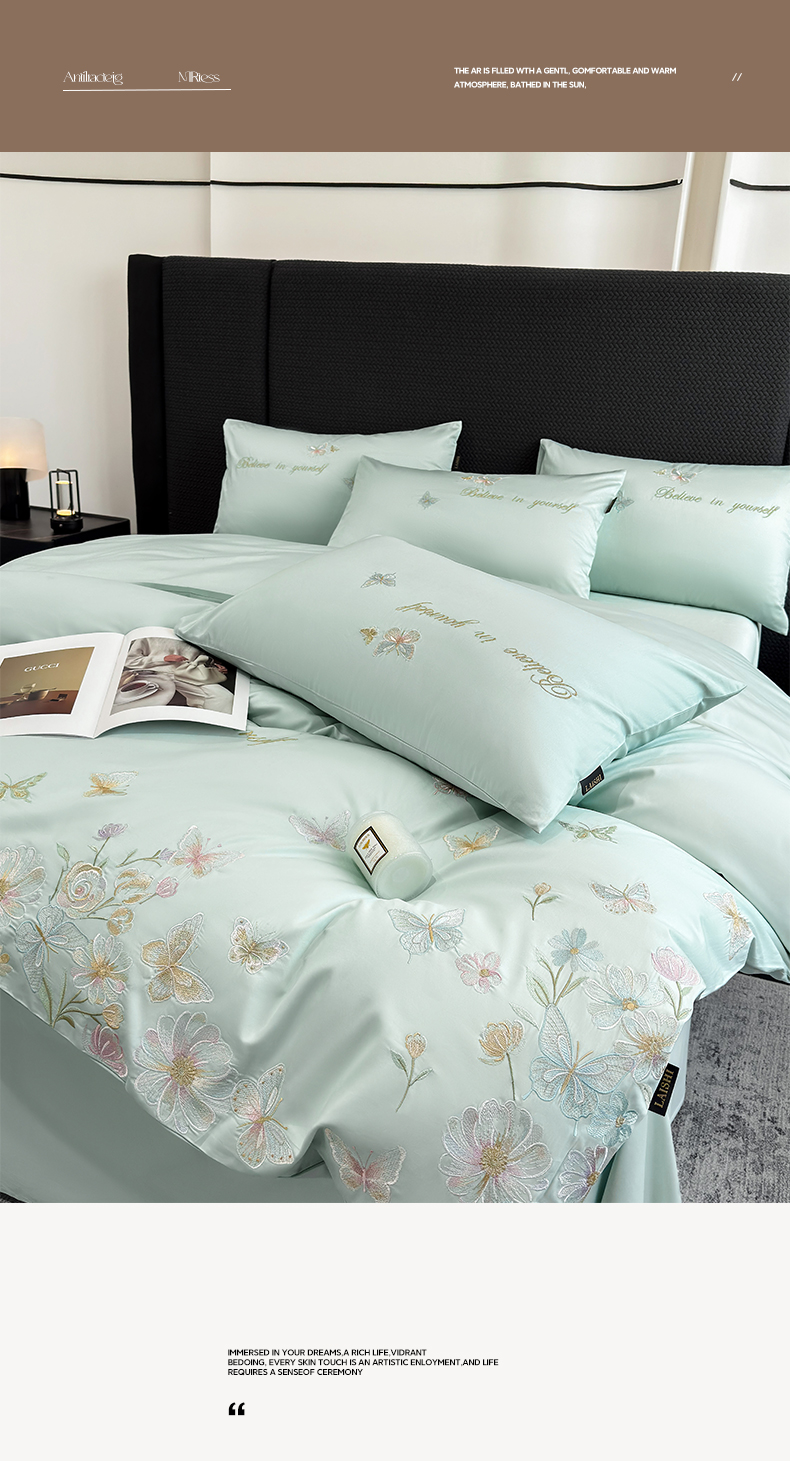当前位置: 91家纺网 > 商品网购 > 床品套件 > 四件套 > 长绒棉四件套 > 欣宜家纺 2026新款50x50s纯棉全棉贡缎长绒棉刺绣绣花四件套【高端礼盒】-蝴蝶泉边 蝴蝶泉边-清新绿
