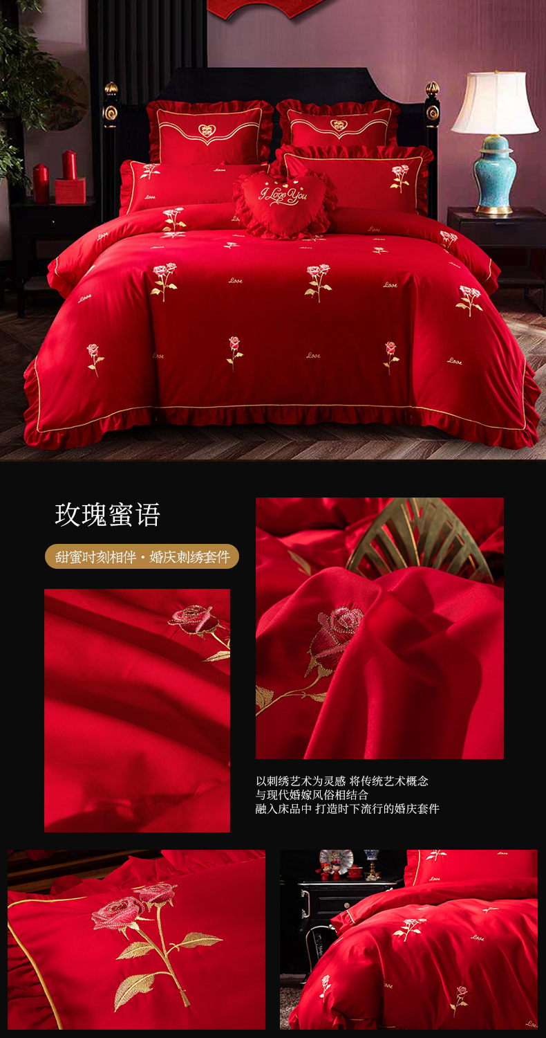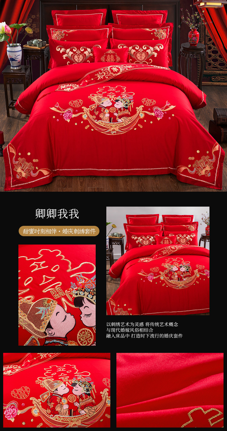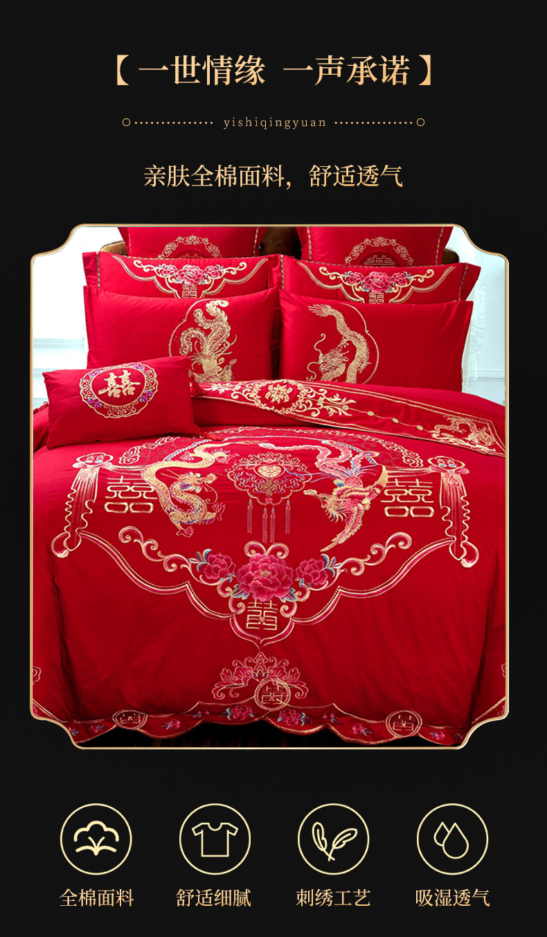 当前位置: 91家纺网 > 商品网购 > 床品套件 > 四件套 > 婚庆四件套 > 慕她家纺 慕她畅销款全棉纯棉婚庆四件套大红色刺绣结婚床上用品 龙凤情深