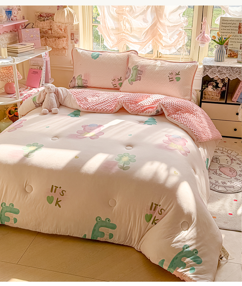 商品名称:丫丫家纺 2026直播热款A类针织棉豆豆被夏被春秋被空调被儿童学生大版卡通被子被芯 粉熊和小鳄