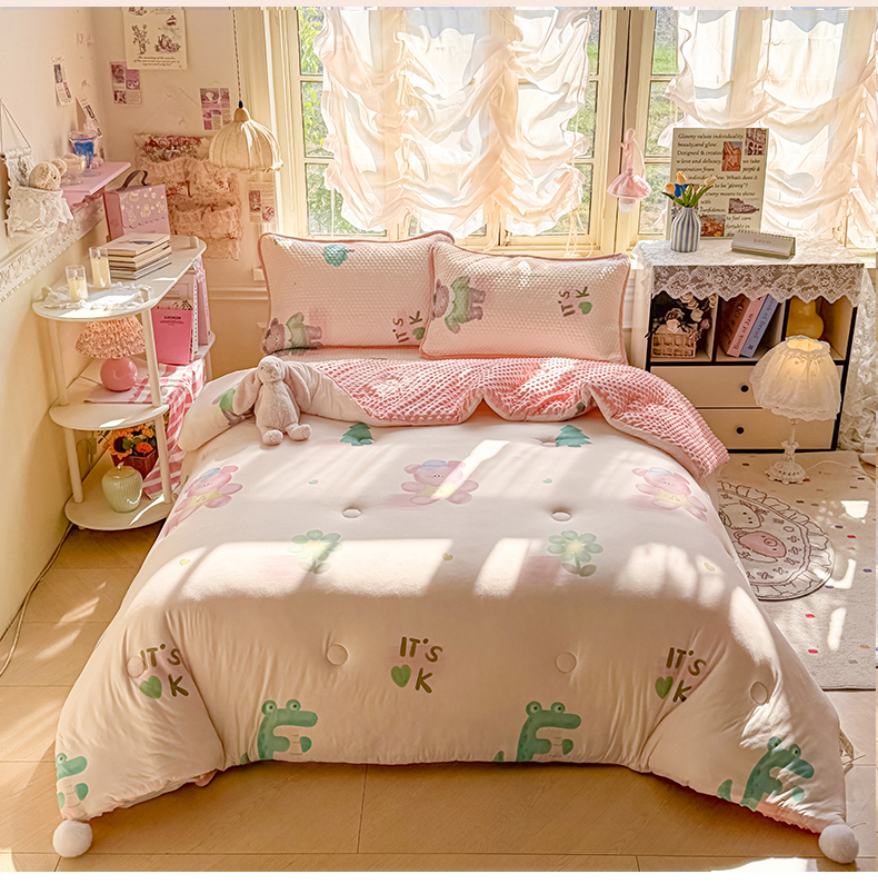 丫丫家纺 2026直播热款A类针织棉豆豆被夏被春秋被空调被儿童学生大版卡通被子被芯 粉熊和小鳄