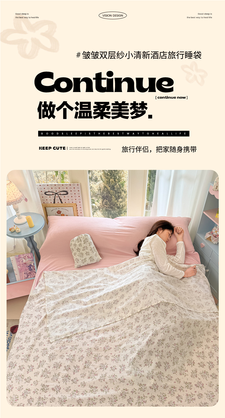 Sweet dreams甜梦 2026新款A类皱皱双层纱小清新酒店一体式旅行睡袋 粉色小碎花