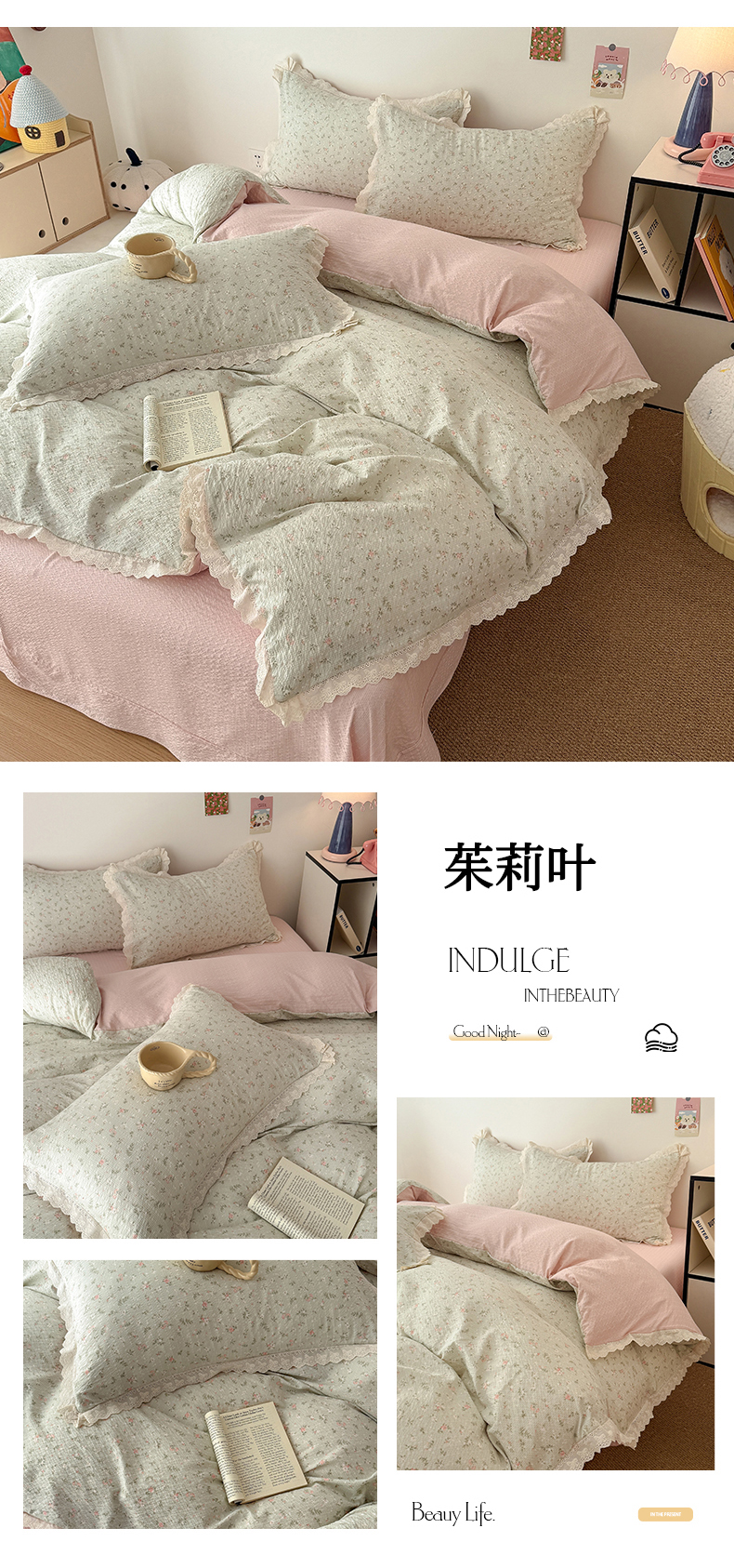 (总)吾欢心 2025新款小香风可可小姐系列花边四件套,可可奶茶绿,可可奶昔粉,可可柠檬黄,可可温柔紫,可可樱桃粉