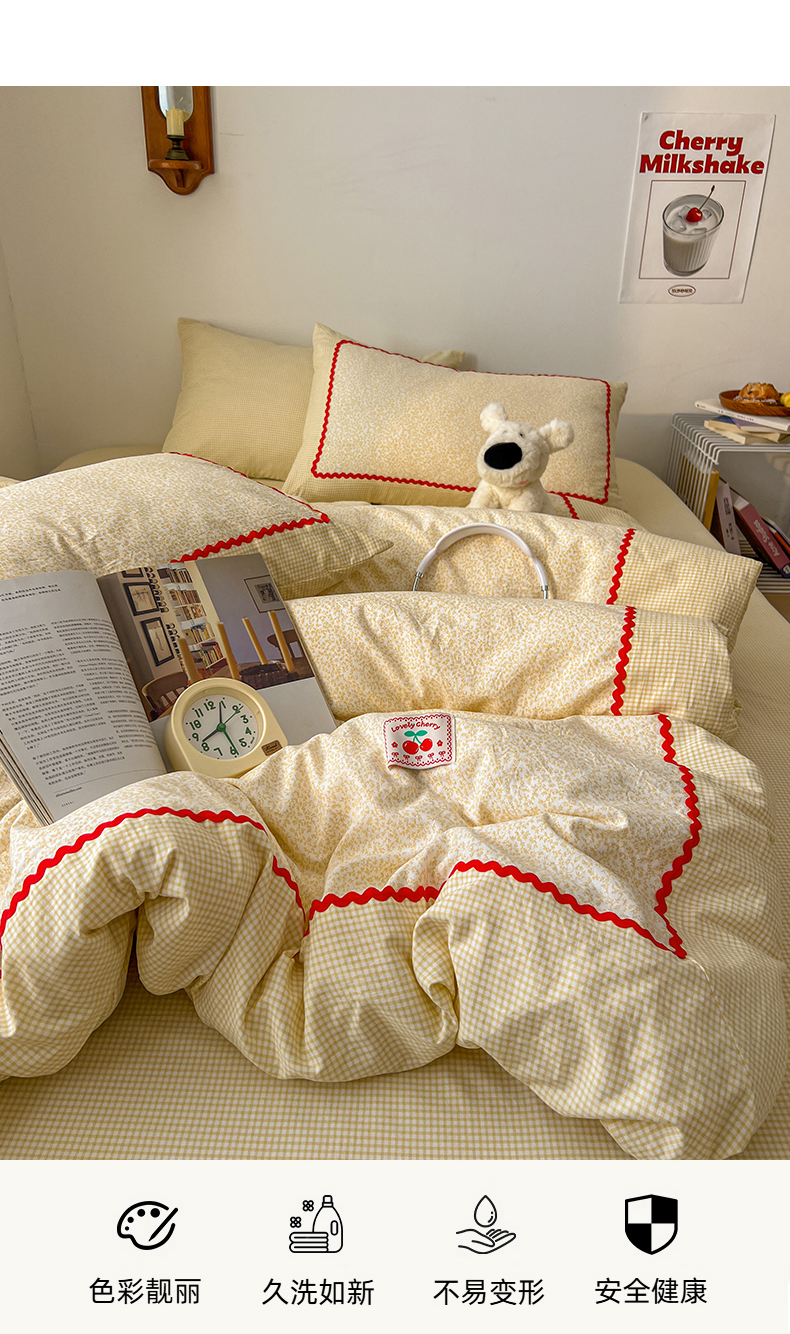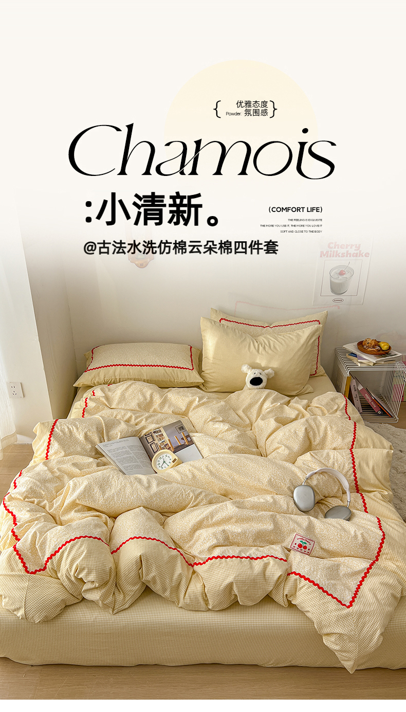(总)睡美美家纺 2026新款古法水洗贴布格纹碎花云朵棉四件套-格纹小碎花,格纹小碎花--奶黄,格纹小碎花--浅咖,格纹小碎花--青柠,格纹小碎花--晴蓝,格纹小碎花--柔粉