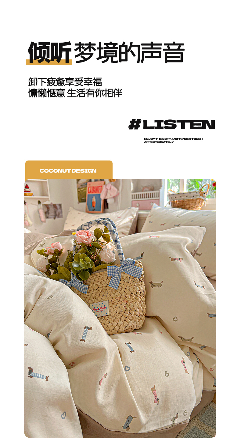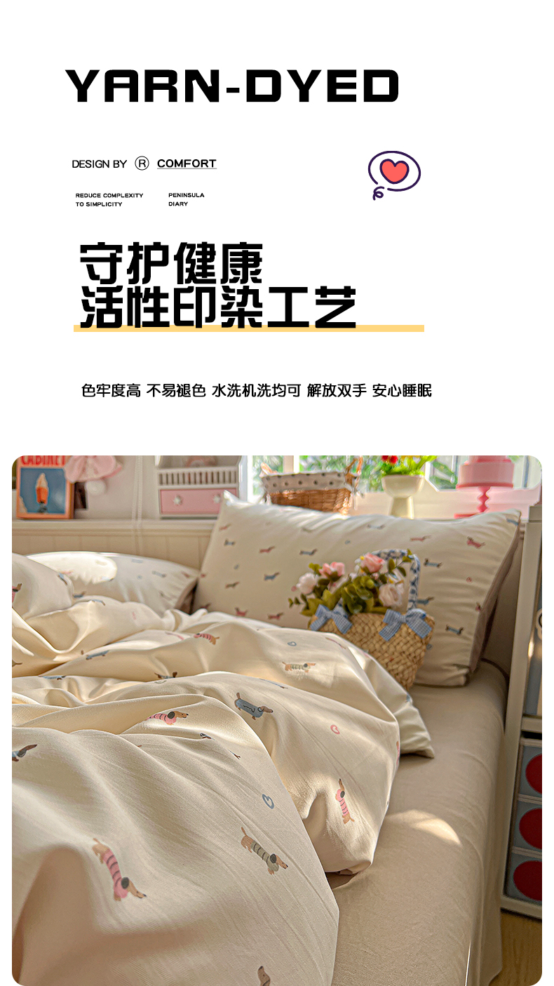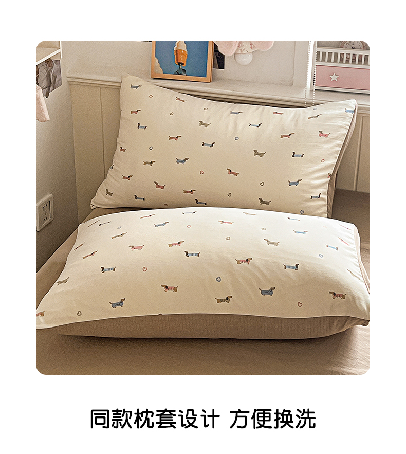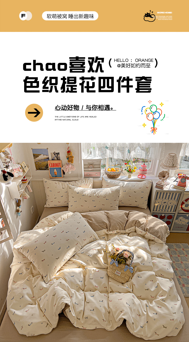 当前位置: 91家纺网 > 商品网购 > 床品套件 > 四件套 > 提花四件套 > 金梦拉家纺 2026春夏新款高克重提花色织印花小布袋四件套 椰椰奶狗