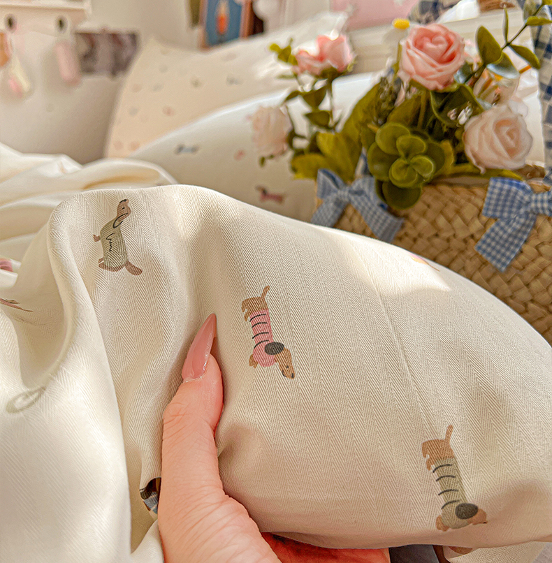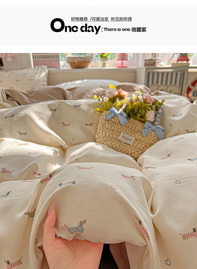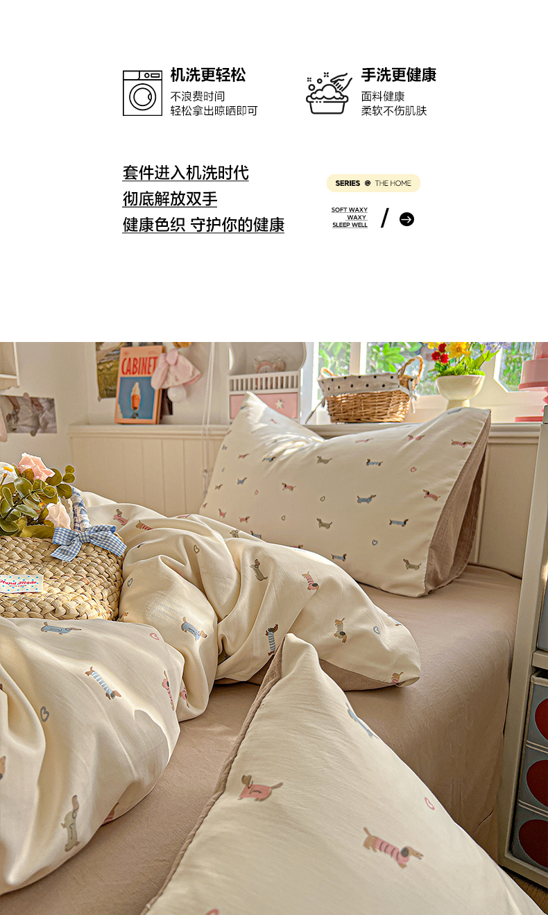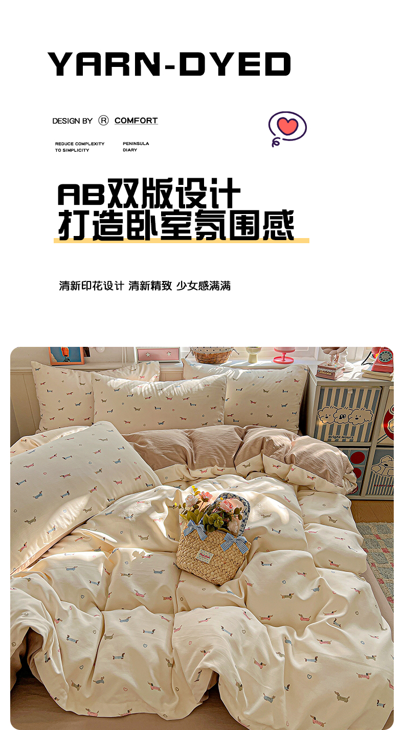 当前位置: 91家纺网 > 商品网购 > 床品套件 > 四件套 > 提花四件套 > 金梦拉家纺 2026春夏新款高克重提花色织印花小布袋四件套 椰椰奶狗