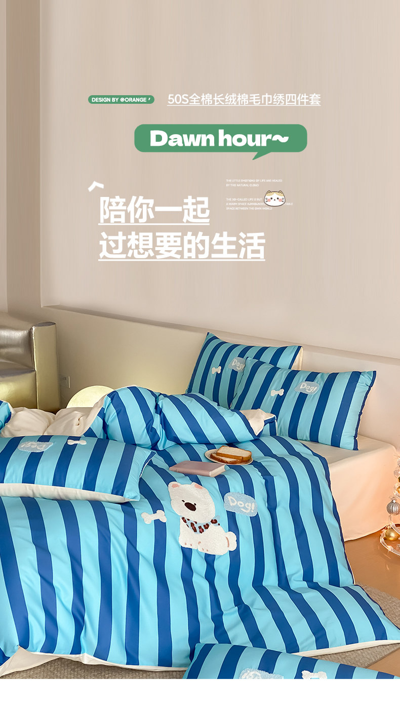 当前位置: 91家纺网 > 商品网购 > 床品套件 > 四件套 > 全棉普通四件套 > 如一 2026新款50S数码全棉长绒棉纯棉毛巾绣四件套 条纹狗