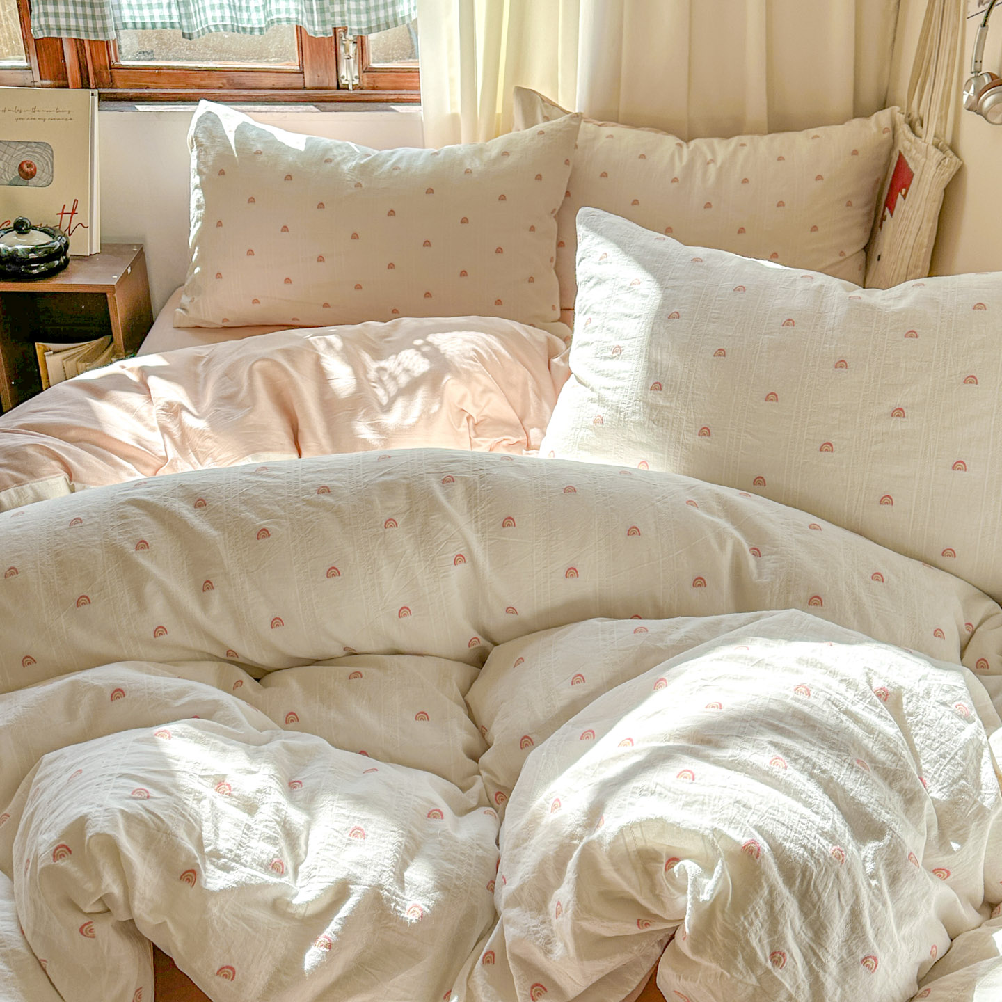 (总)田野 2026新款水洗棉提花人字小清新系列四件套,彩虹糖,草莓奶绿,粉雾细条,红樱漾蓝,晴空蓝条,甜心熊,雾蓝蝴蝶结