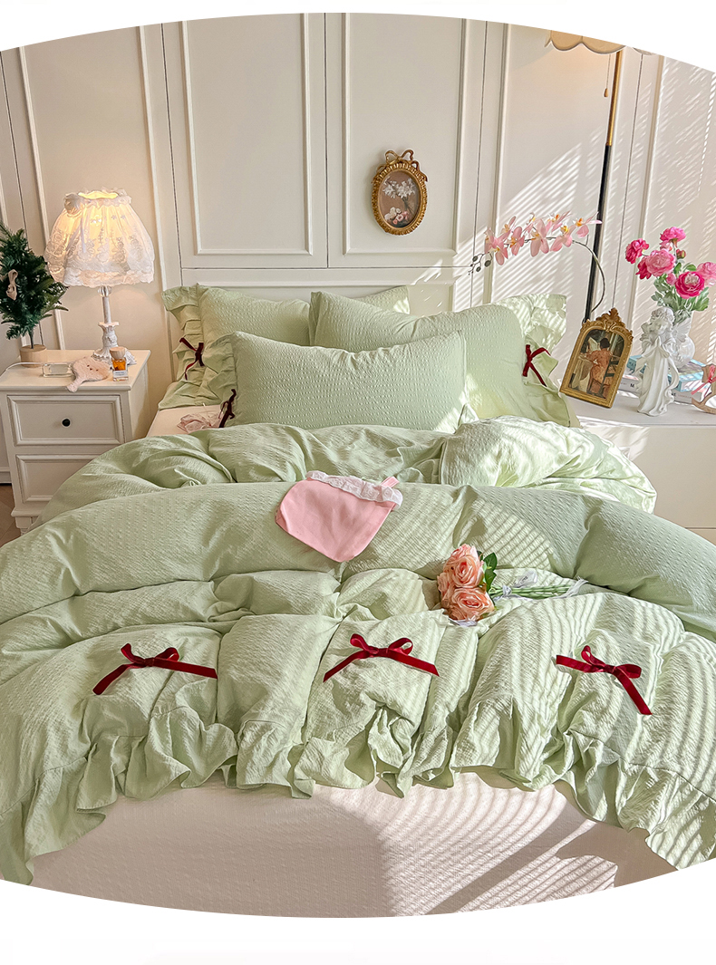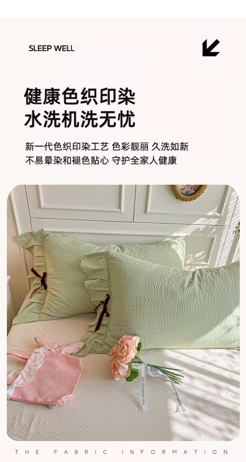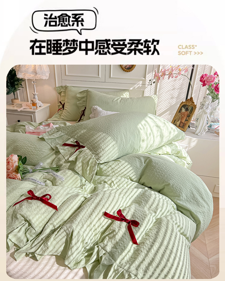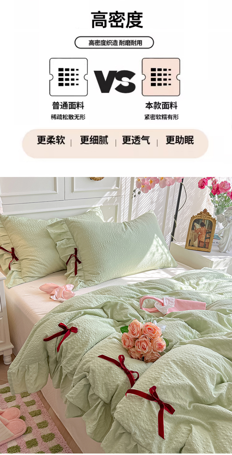 当前位置: 91家纺网 > 商品网购 > 床品套件 > 四件套 > 其它四件套 > 瑞禾家纺(原阿亮) 2026春夏新款提花泡芙棉花边蝴蝶结床单床笠四件套-甜心公主 甜心公主-薄荷绿