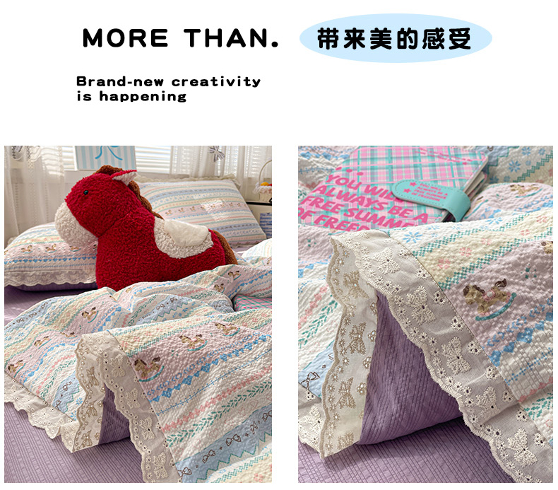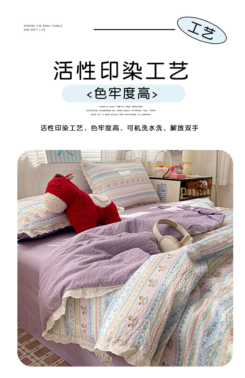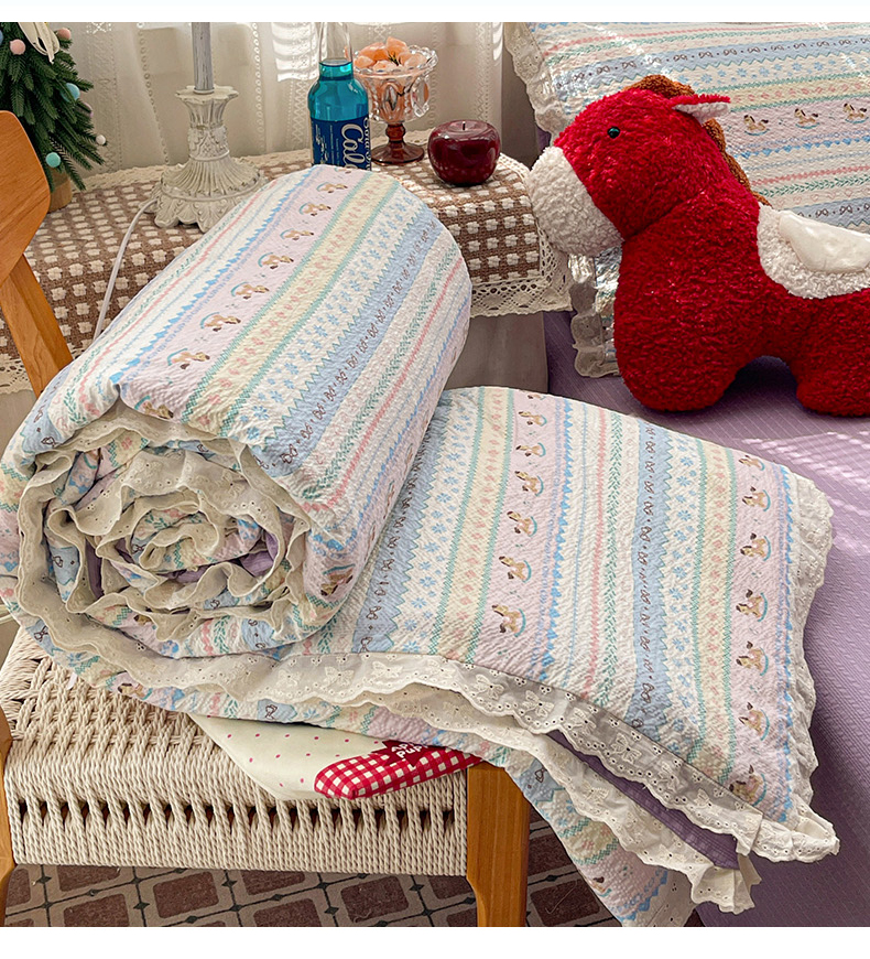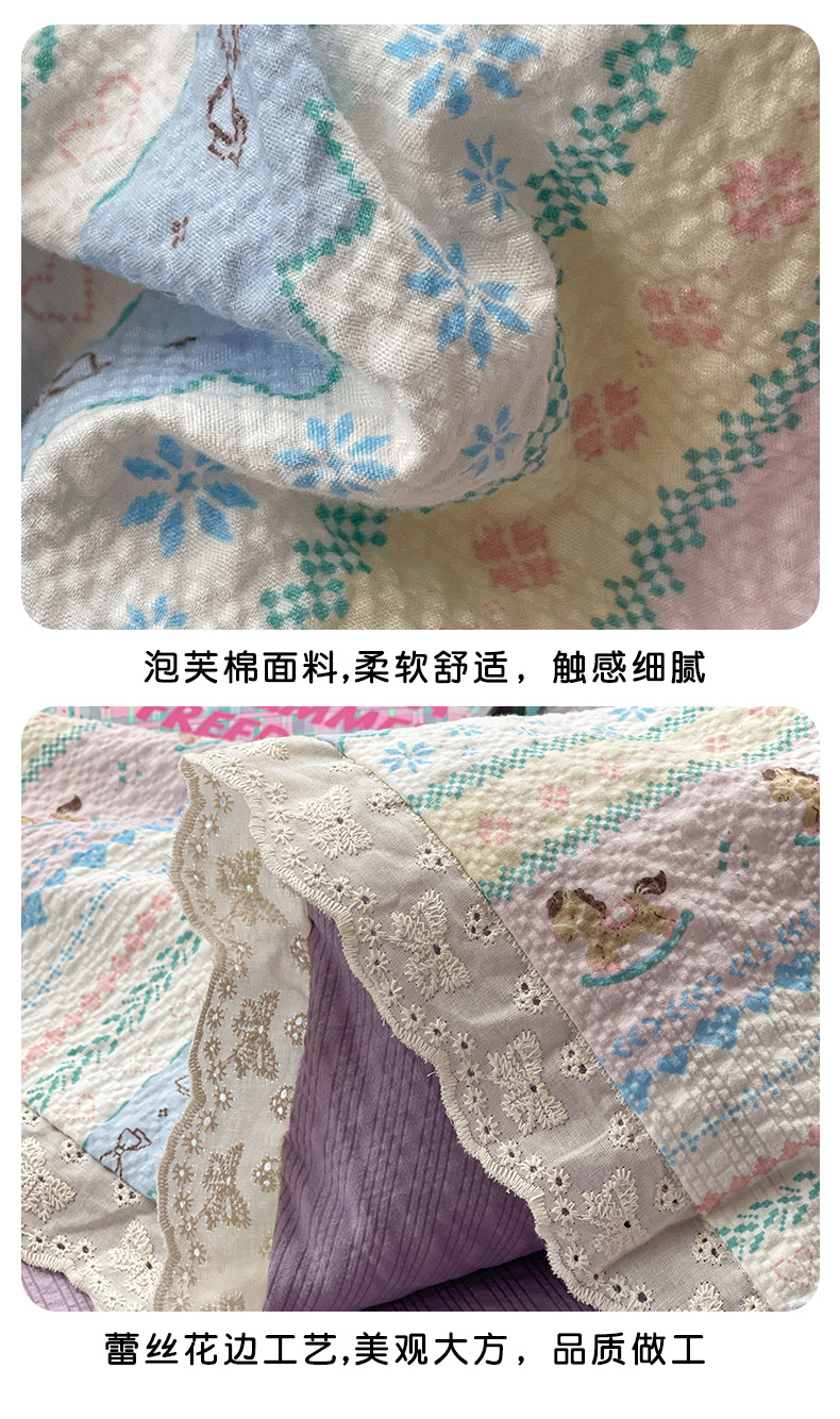 优承佳生活馆 2026新款超柔高克重泡芙纱蝴蝶结全棉花边夏被套件单夏被 木马彩虹