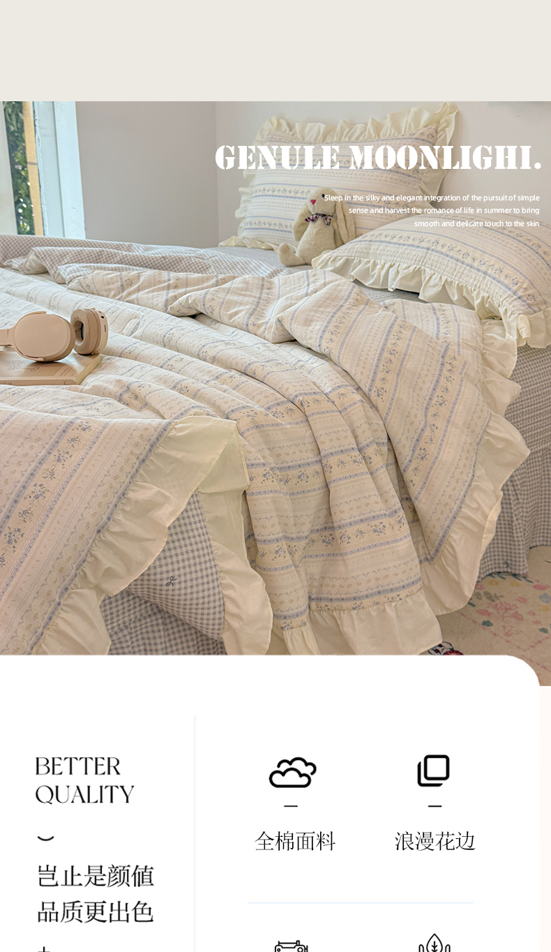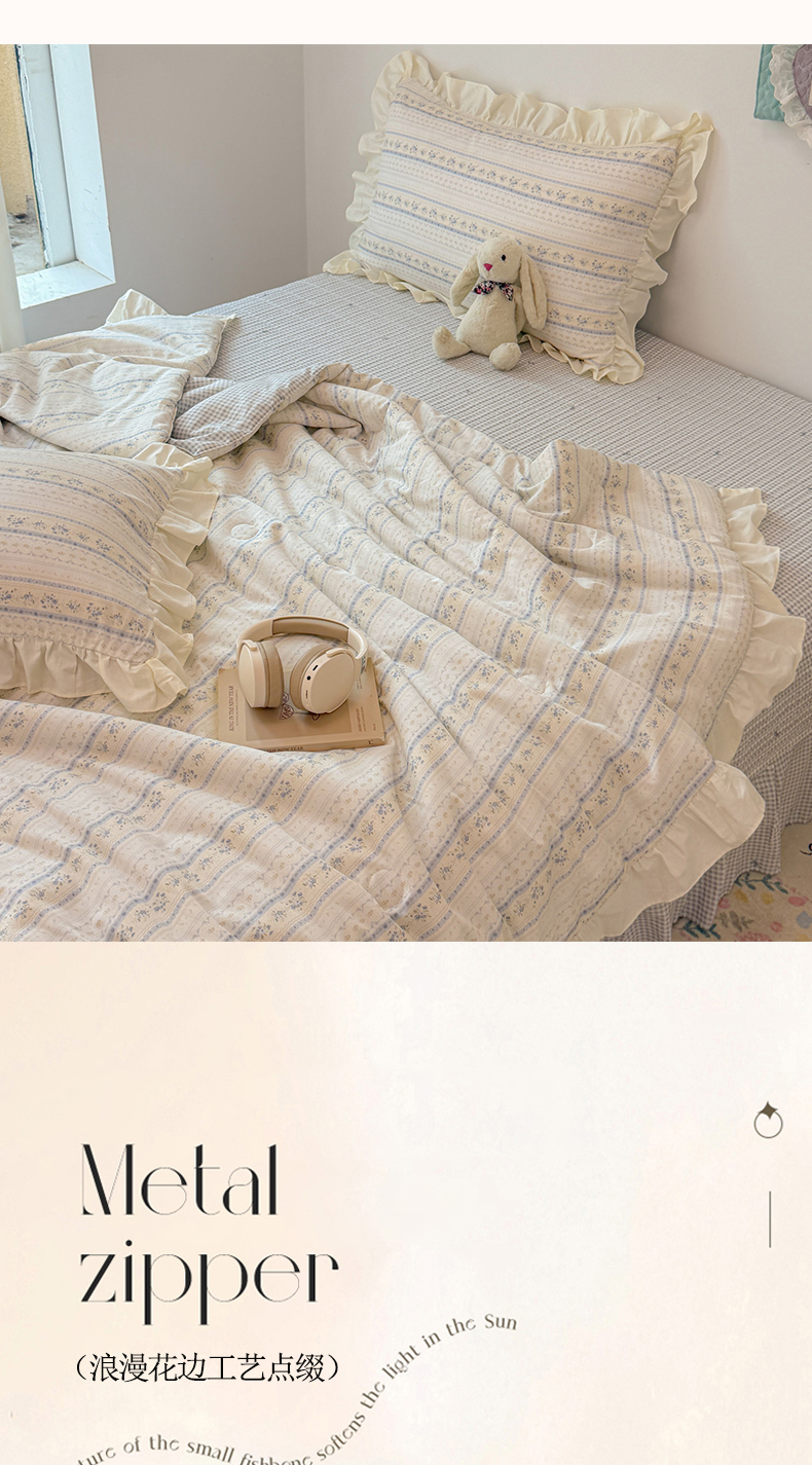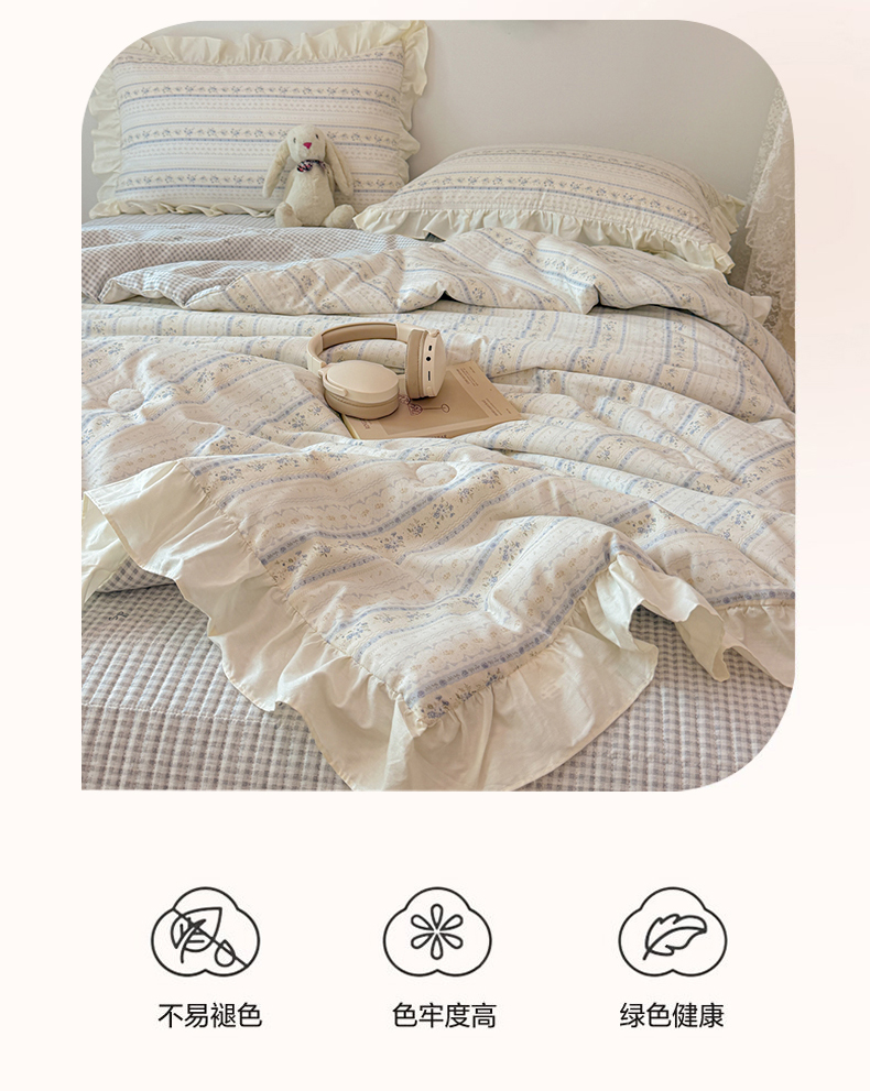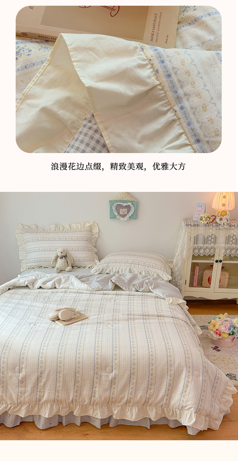 当前位置: 91家纺网 > 商品网购 > 床品套件 > 四件套 > 夏被四件套 > 简宜家居(朝初家纺) 2026新款全棉花边夏被全棉床盖夏被四件套 素条花-蓝