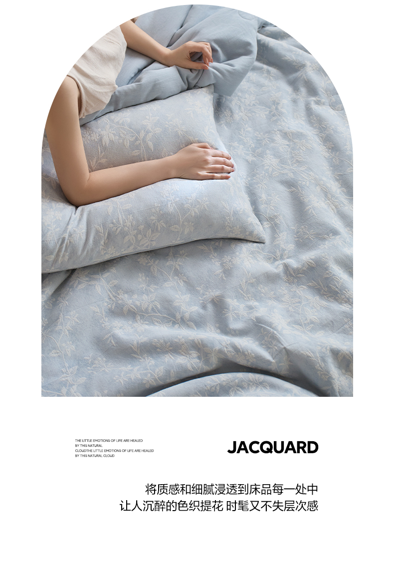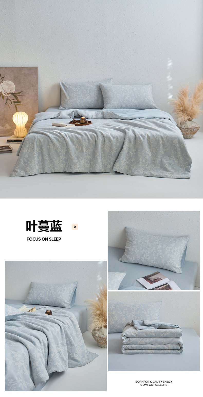 • 91家纺网 家纺一手货源 找家纺 如一 2026新款60S全棉色织提花三层纱夏被四件套叶蔓系列 叶蔓蓝
