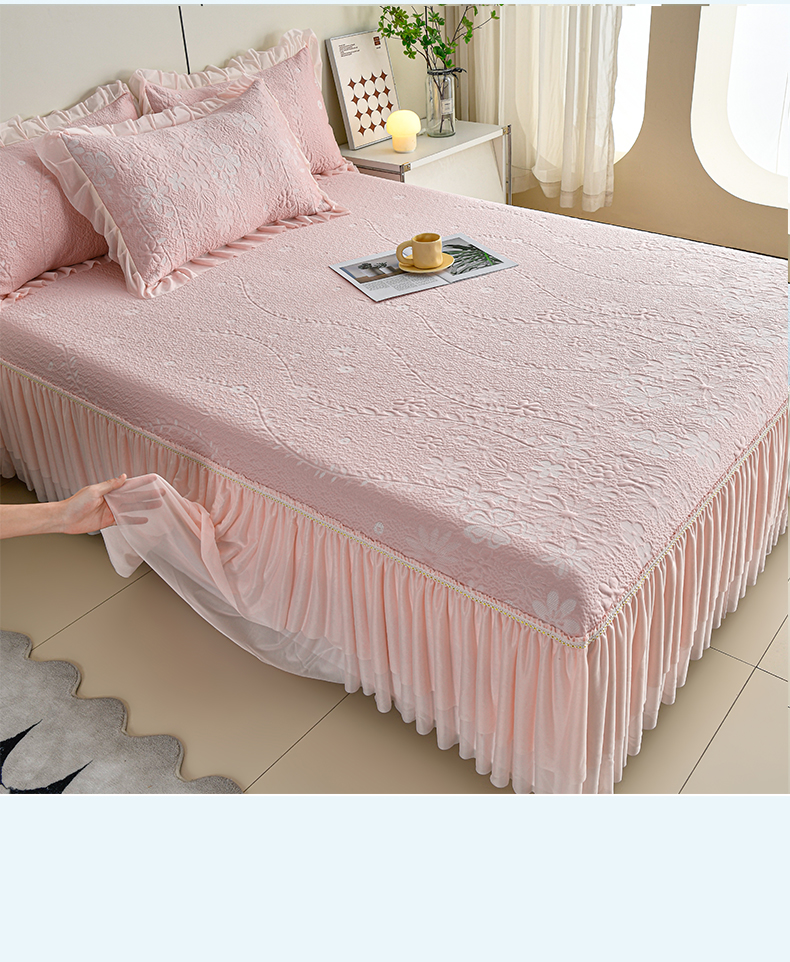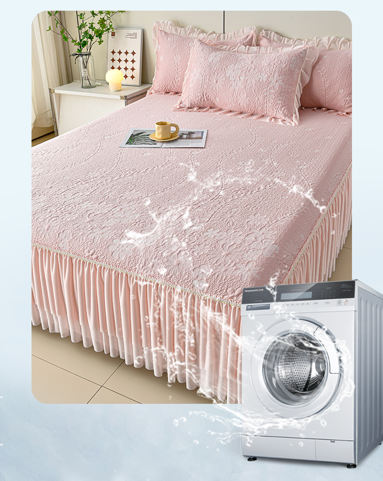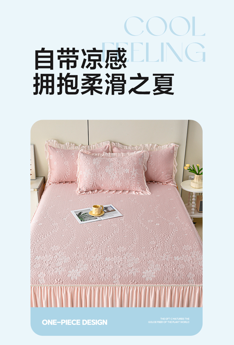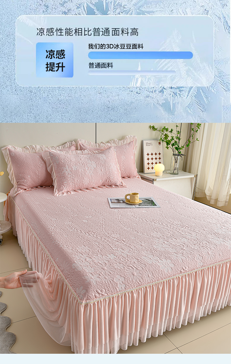 (总)畅畅家纺 2026新款锦氨夏被PE凉感豆豆凉席绣花三明治复合床裙三件套四件套,格韵-粉-床裙款,格韵-灰-床裙款,格韵-蓝-床裙款,格韵-绿-床裙款