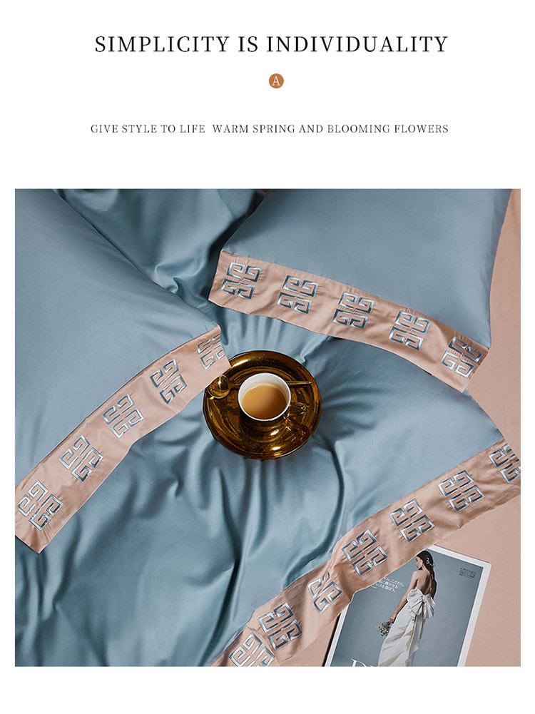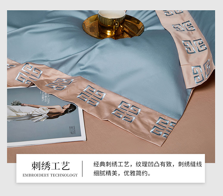 商品名称:爱缦 2021宫系列100S长绒棉澳棉刺绣四件套灰蓝-黎莎棕