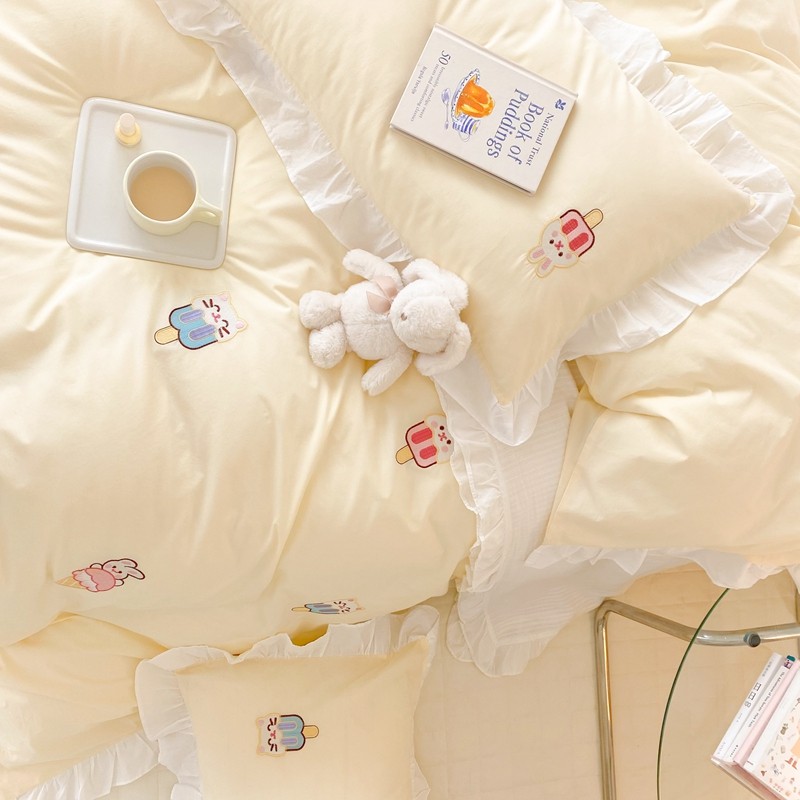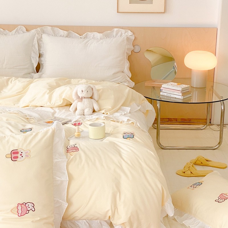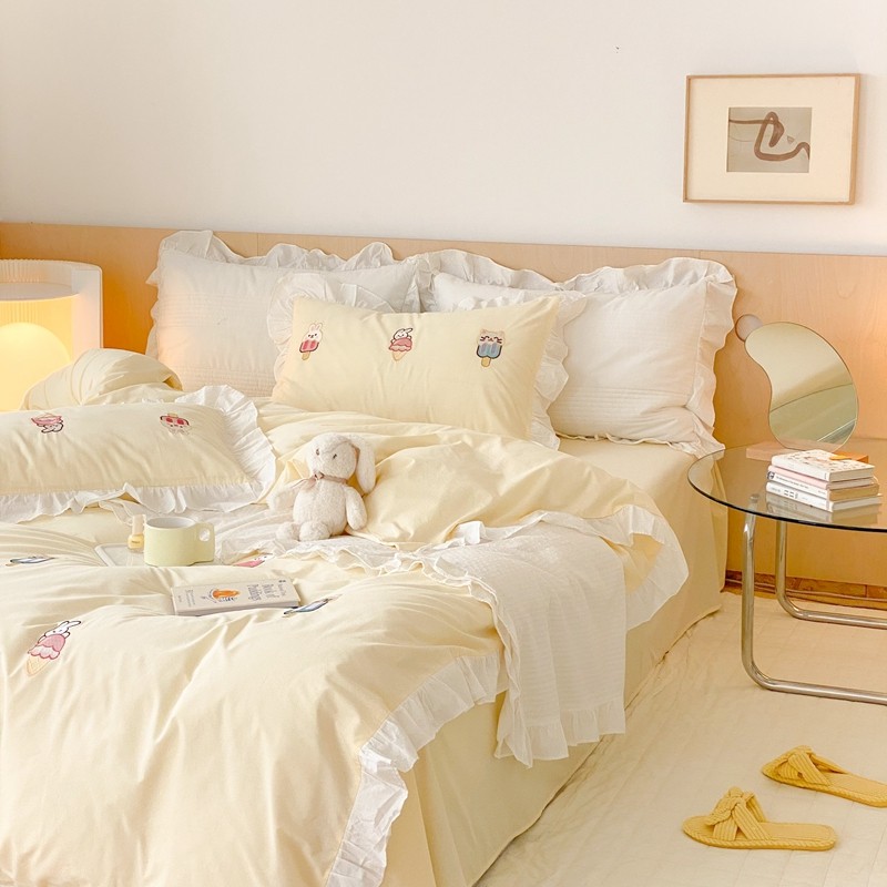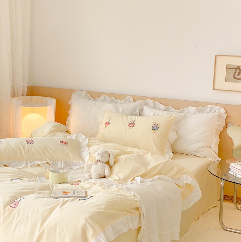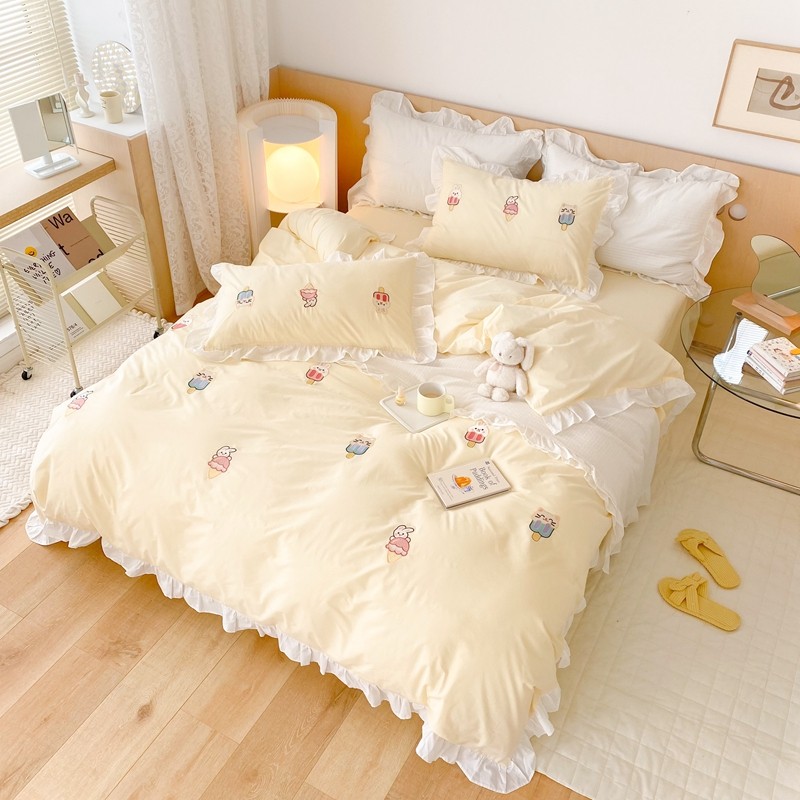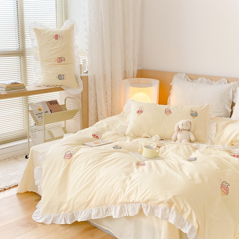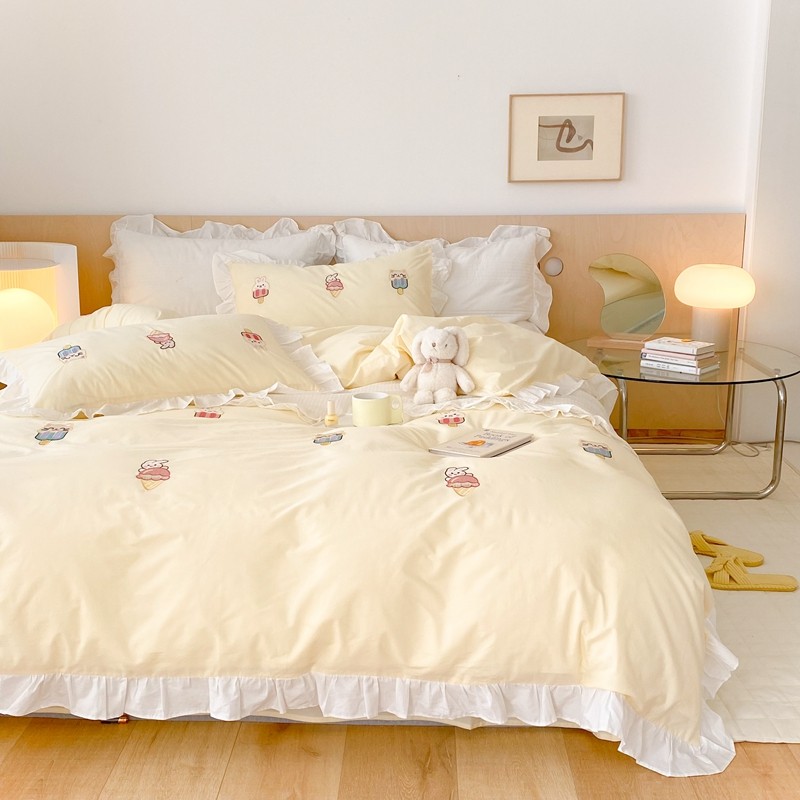 本希新款40全棉水洗棉荷叶边刺绣小清新四件套奶油冰激凌奶油黄