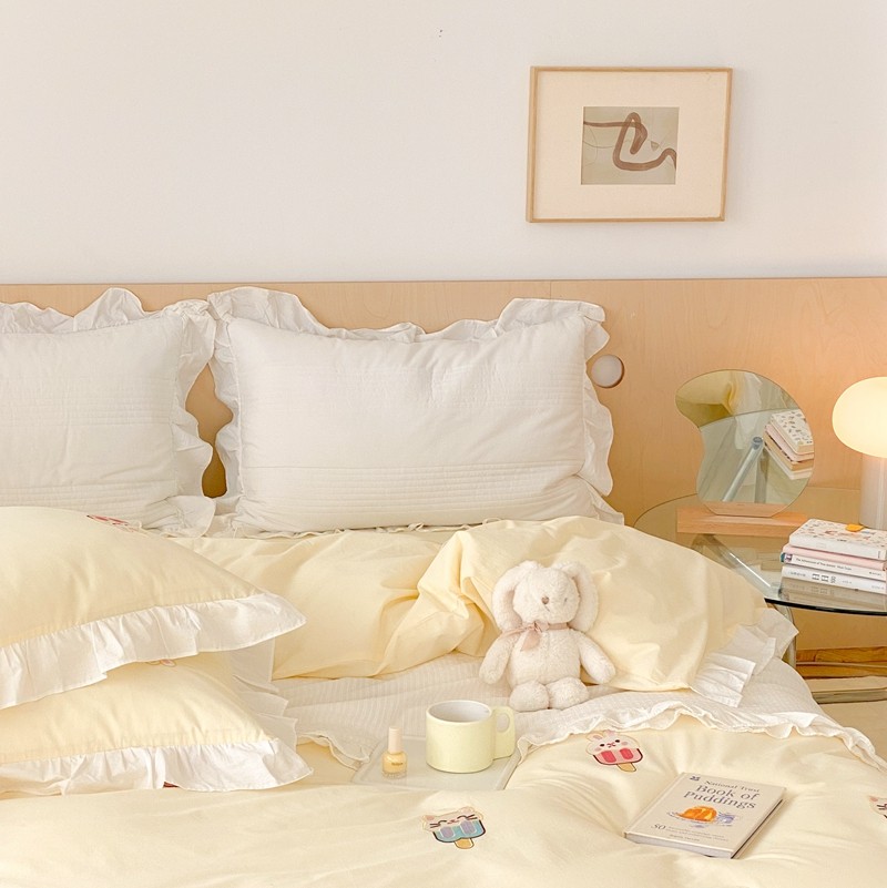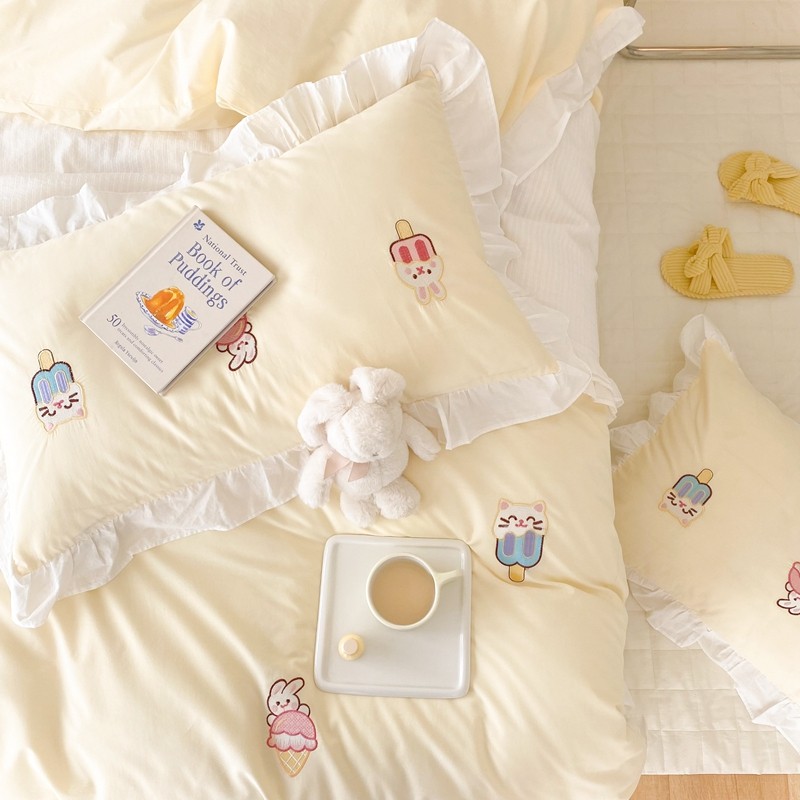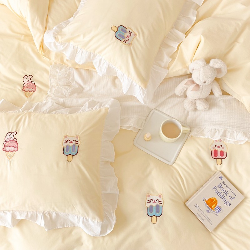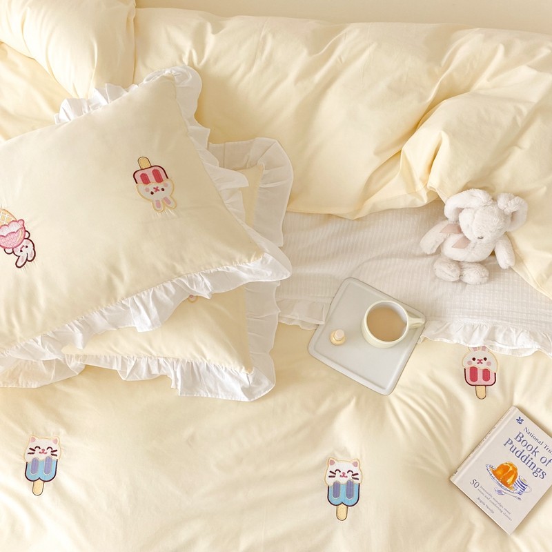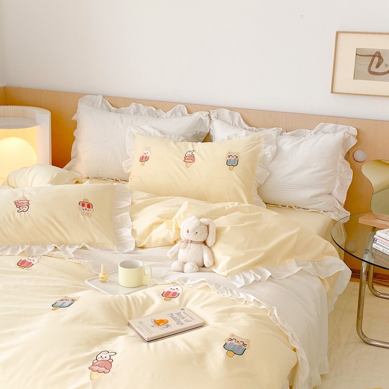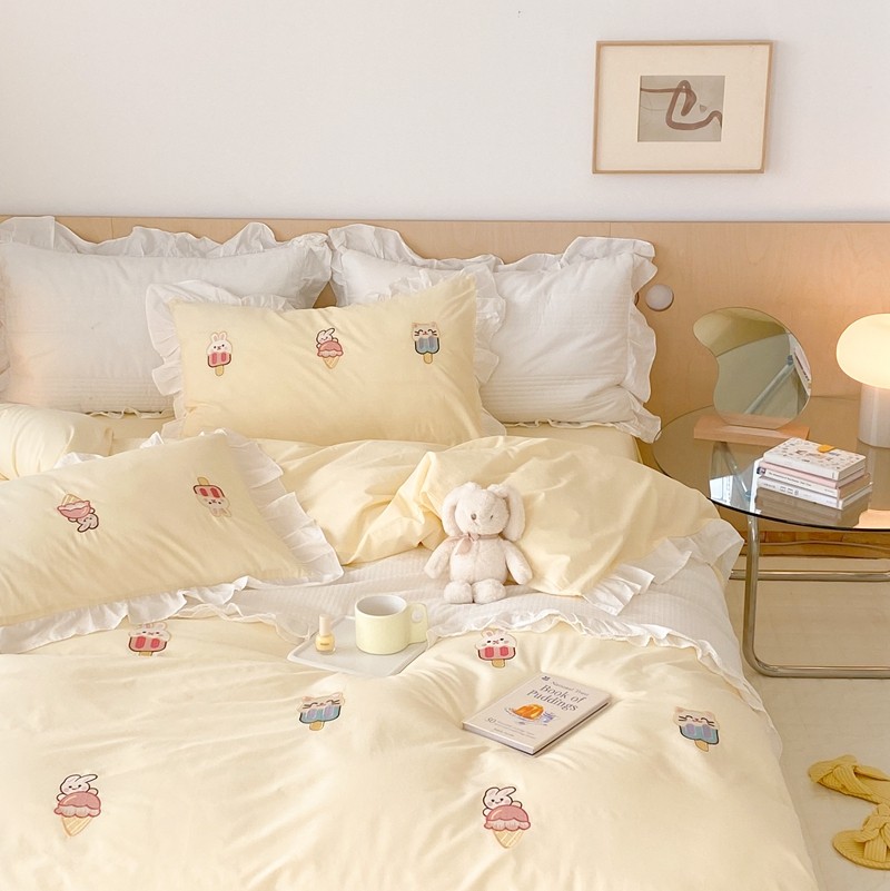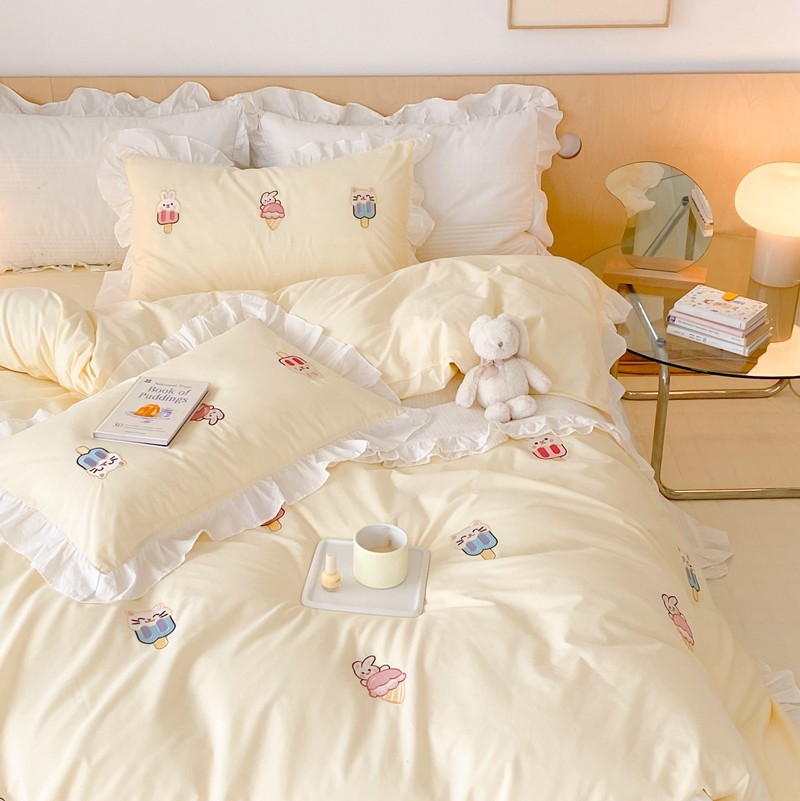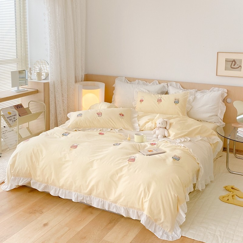 本希新款40全棉水洗棉荷叶边刺绣小清新四件套奶油冰激凌奶油黄
