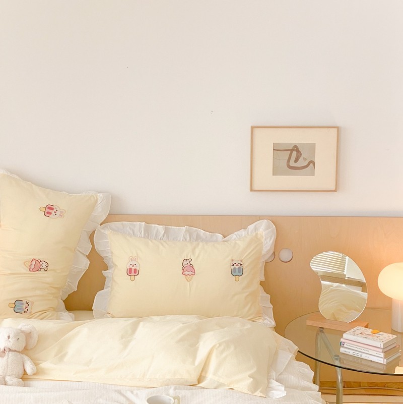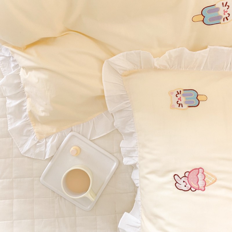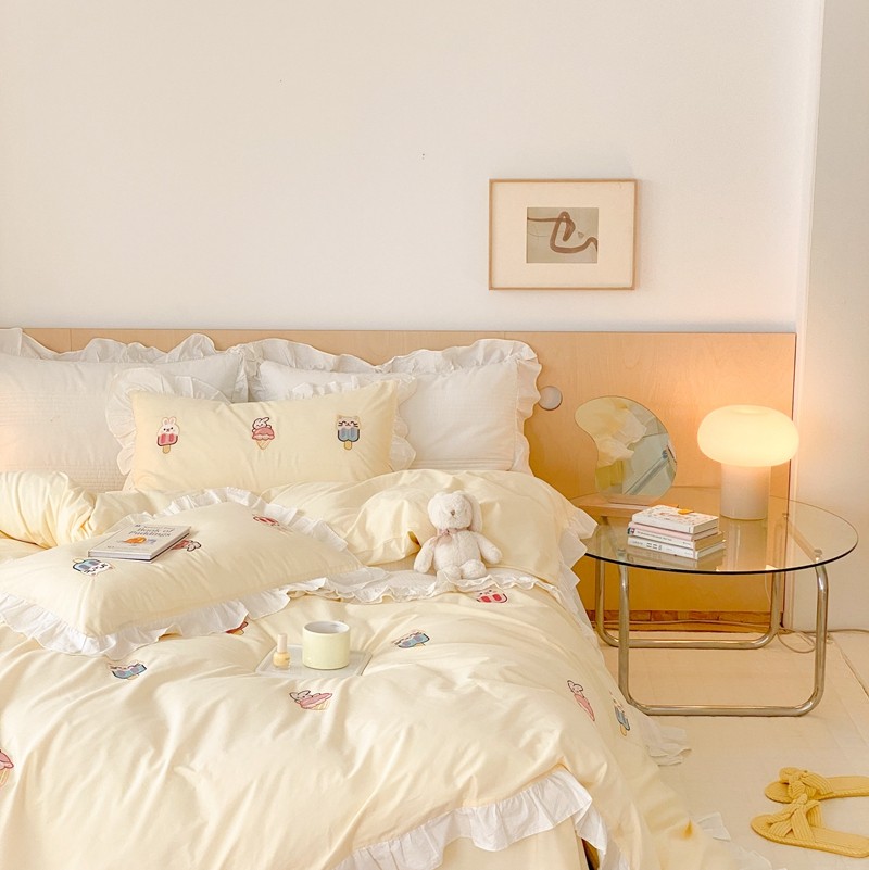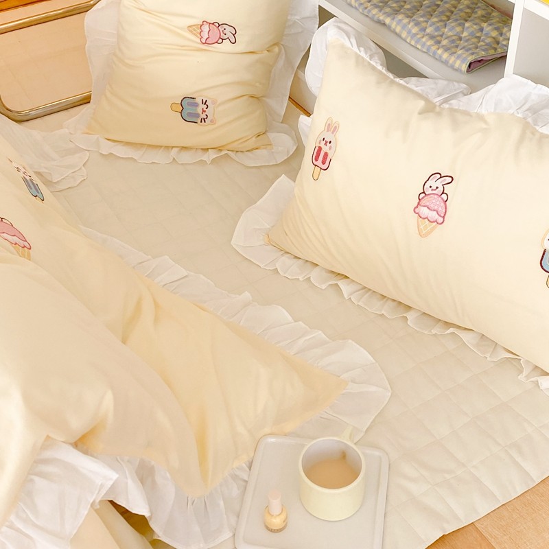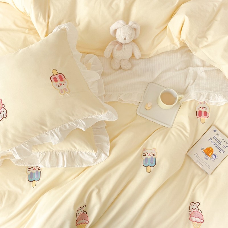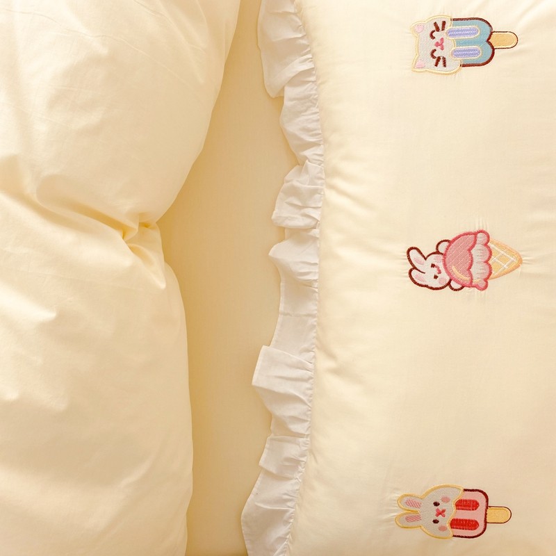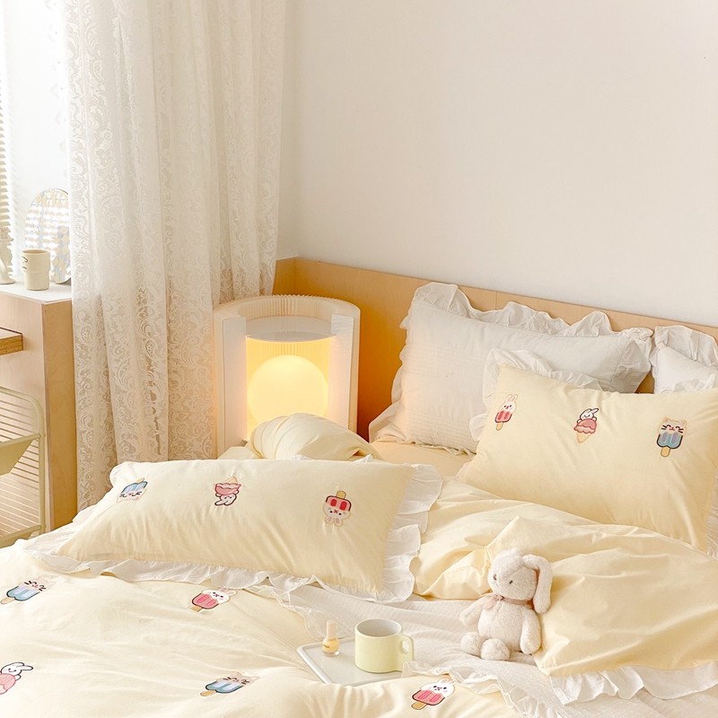 本希新款40全棉水洗棉荷叶边刺绣小清新四件套奶油冰激凌奶油黄