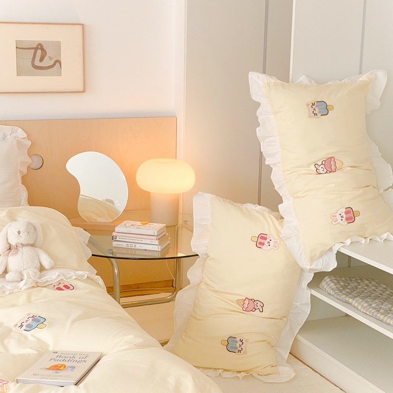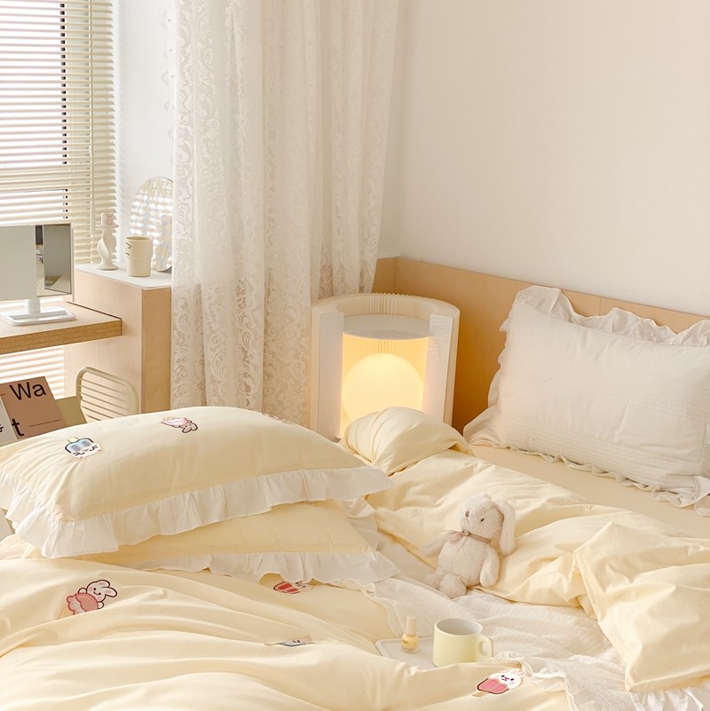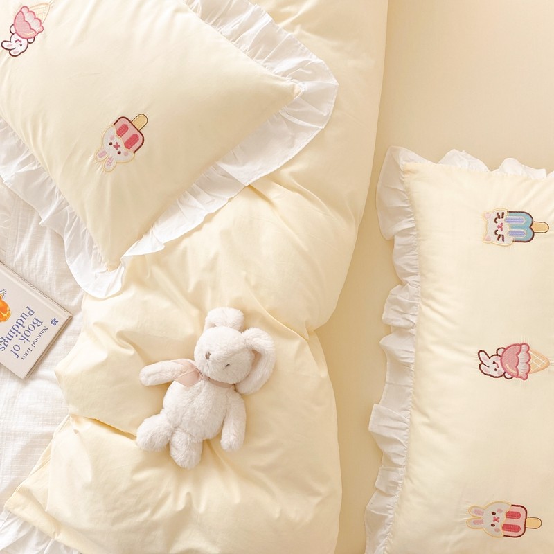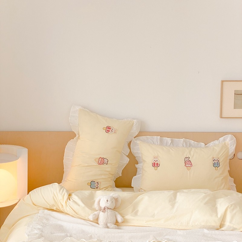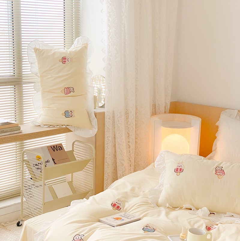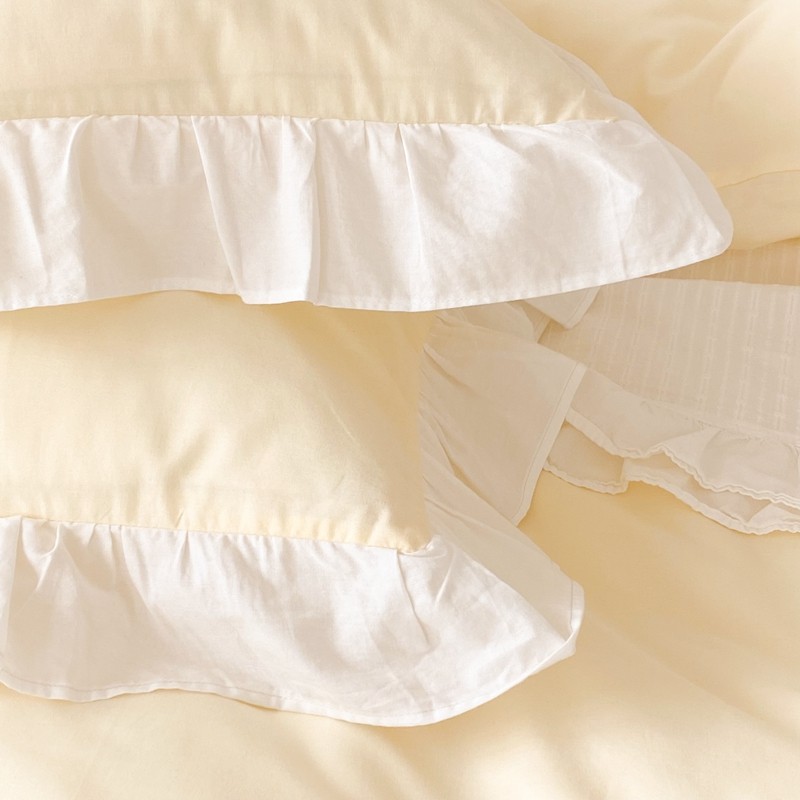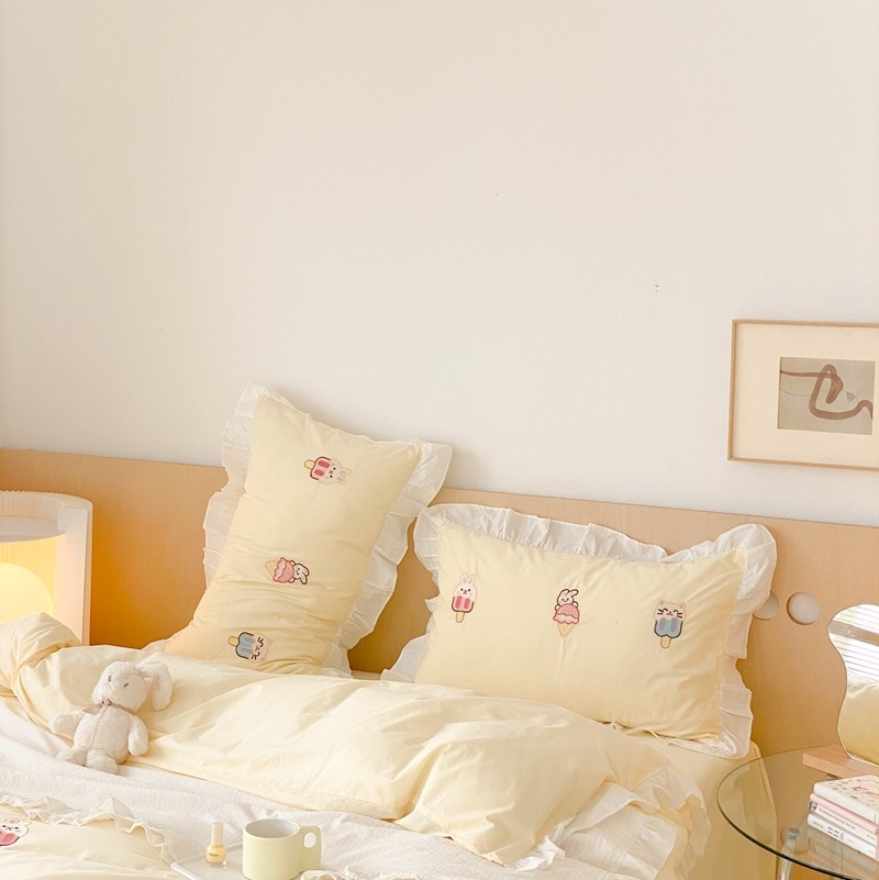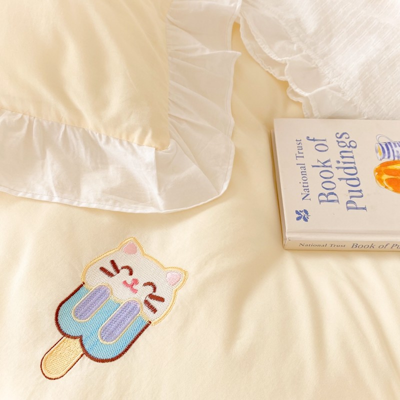 本希新款40全棉水洗棉荷叶边刺绣小清新四件套奶油冰激凌奶油黄