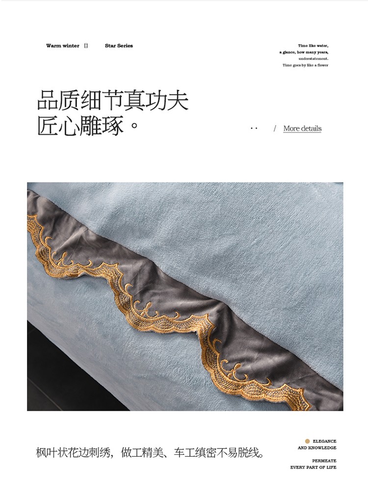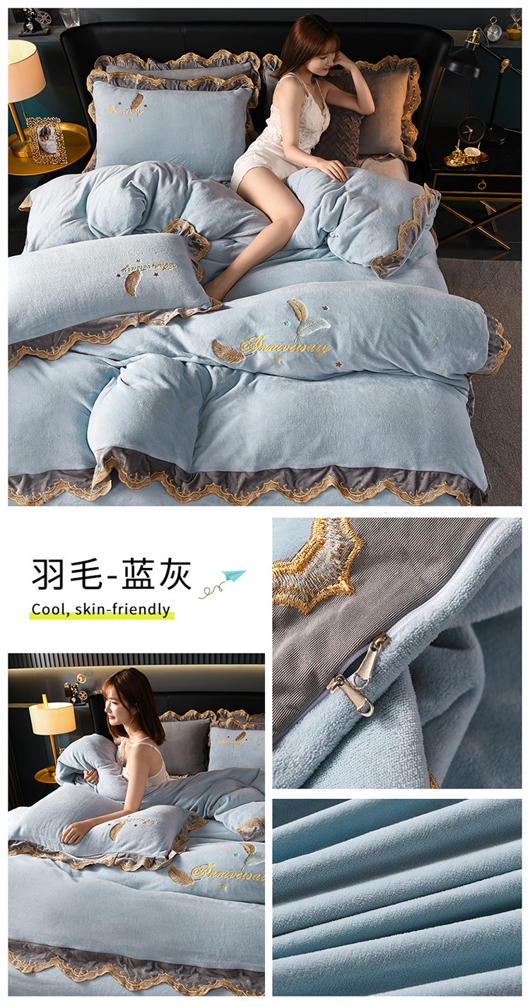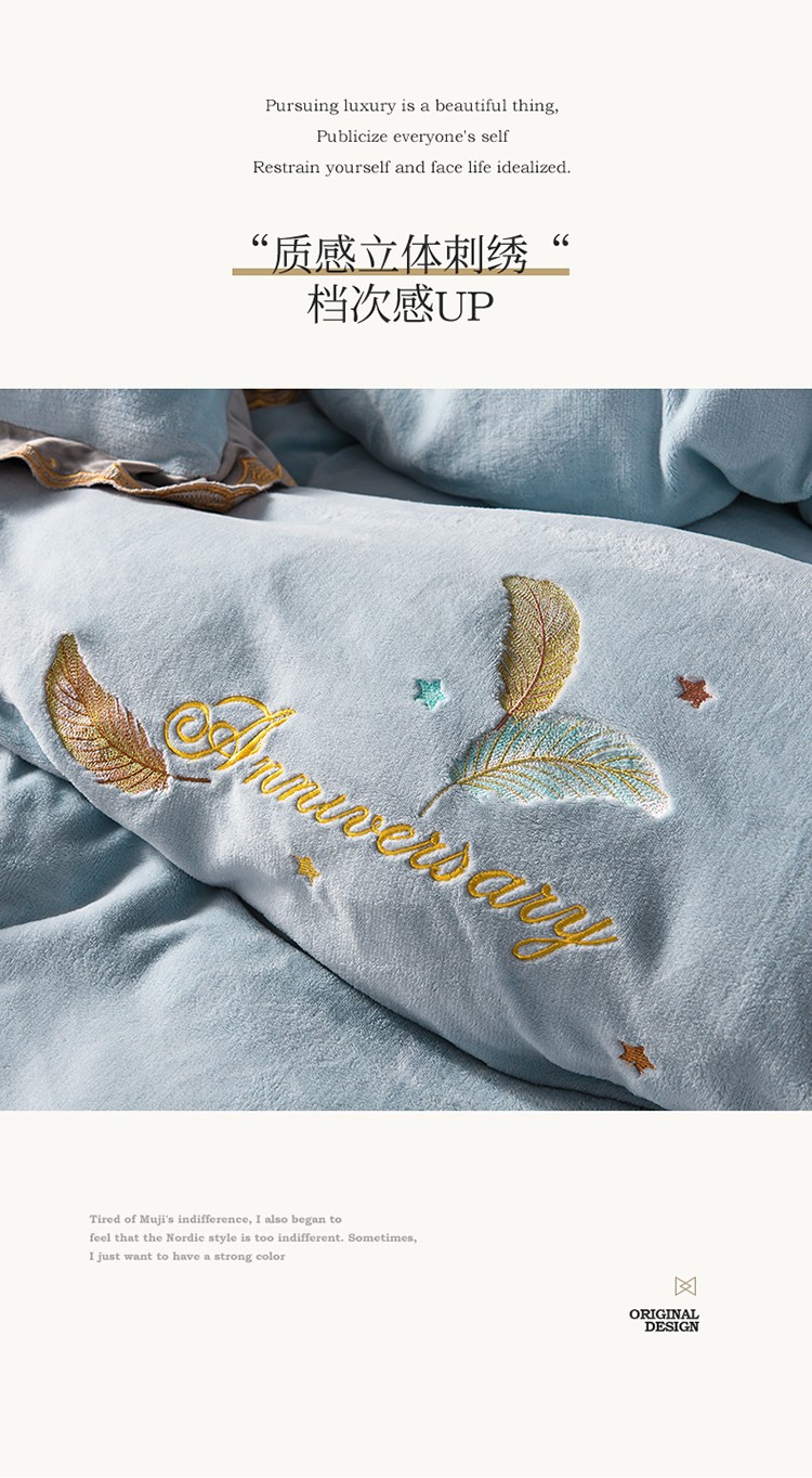 商品名称:兄弟坊2021新款牛奶绒花边刺绣四套件 羽毛-蓝灰