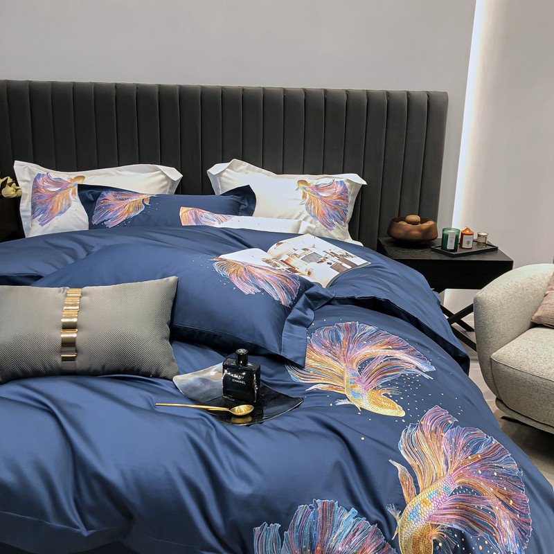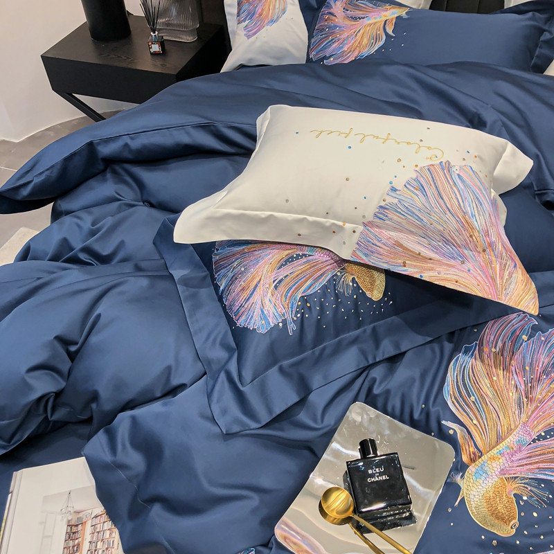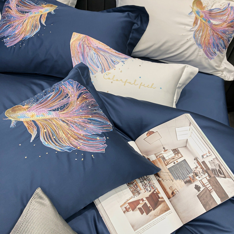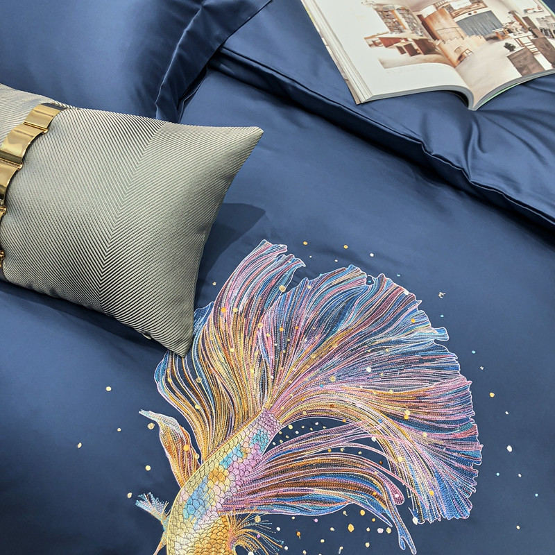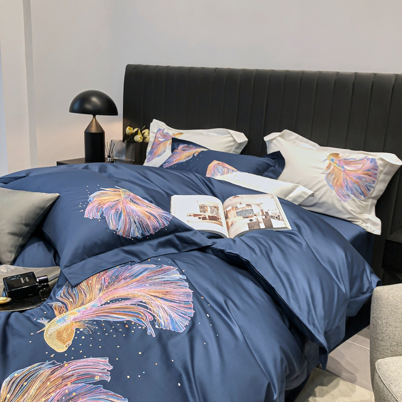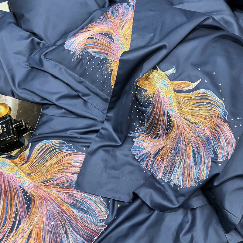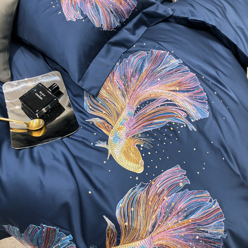 商品名称:鹿班 2022新款100支长绒棉四件套-彩虹锦鲤 深蓝