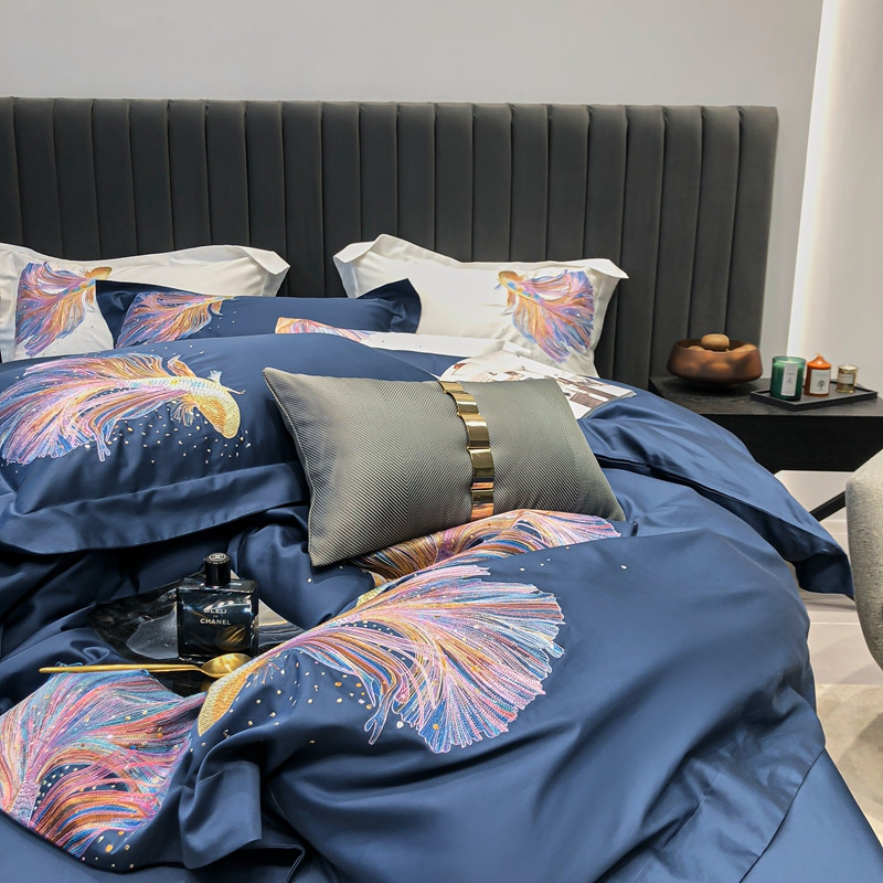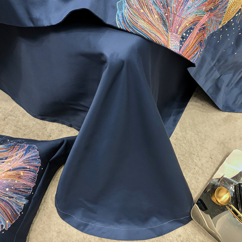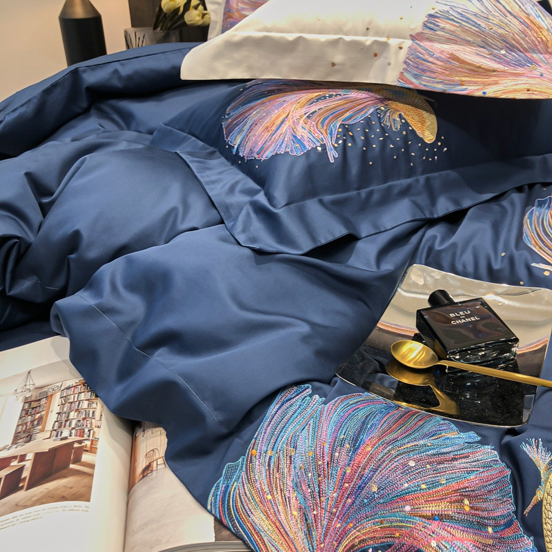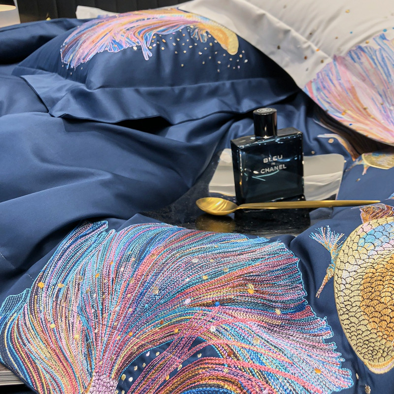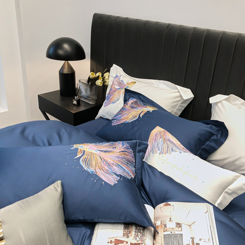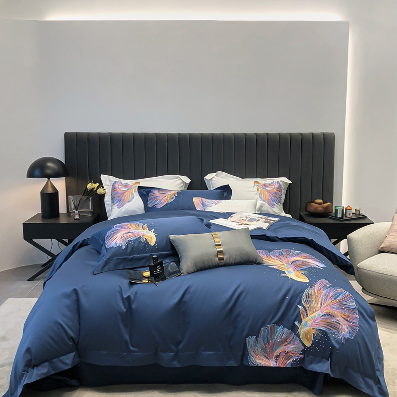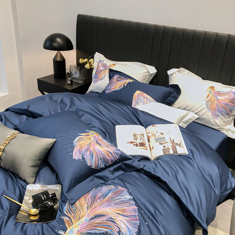 商品名称:鹿班 2022新款100支长绒棉四件套-彩虹锦鲤 深蓝